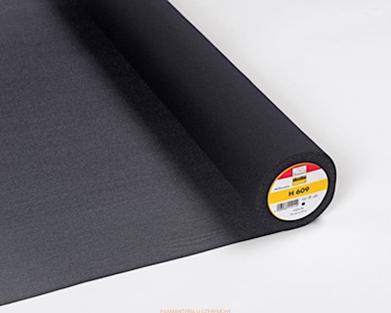 Bardzo elastyczny dziany wkład odzieżowy tkany Vilene H 609 w kolorze czarnym, do przyklejania żelazkiem. Produkt niemieckiej firmy Freudenberg, znanego i docenianego producenta.