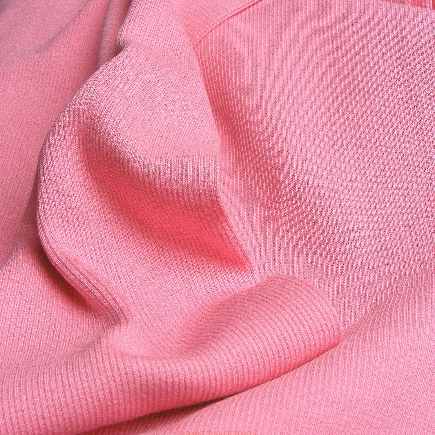 Dzianina ściągaczowa w kolorze różowym. Ściągacz o wyraźnym żebrowaniu /typu 2 oczka prawe x 2 oczka lewe/.