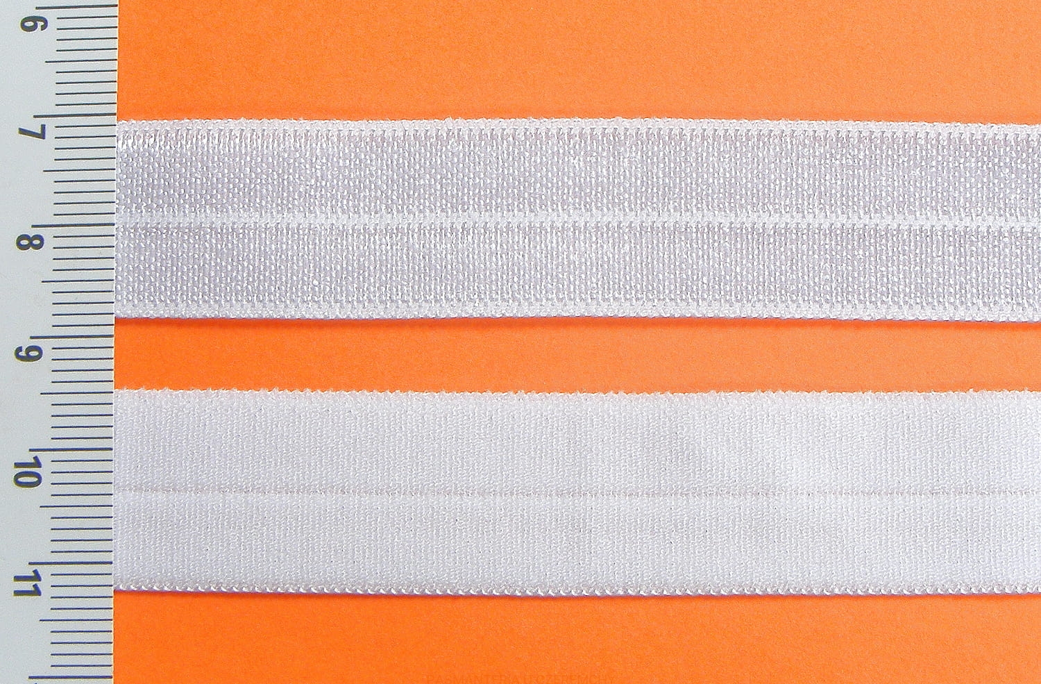 Biała guma łamana szerokości 18 mm z satynowym połyskiem po jednej, a matowa po drugiej stronie. W połowie szerokości delikatnie zaznaczone załamanie ułatwiające złożenie gumy wzdłuż na pół.