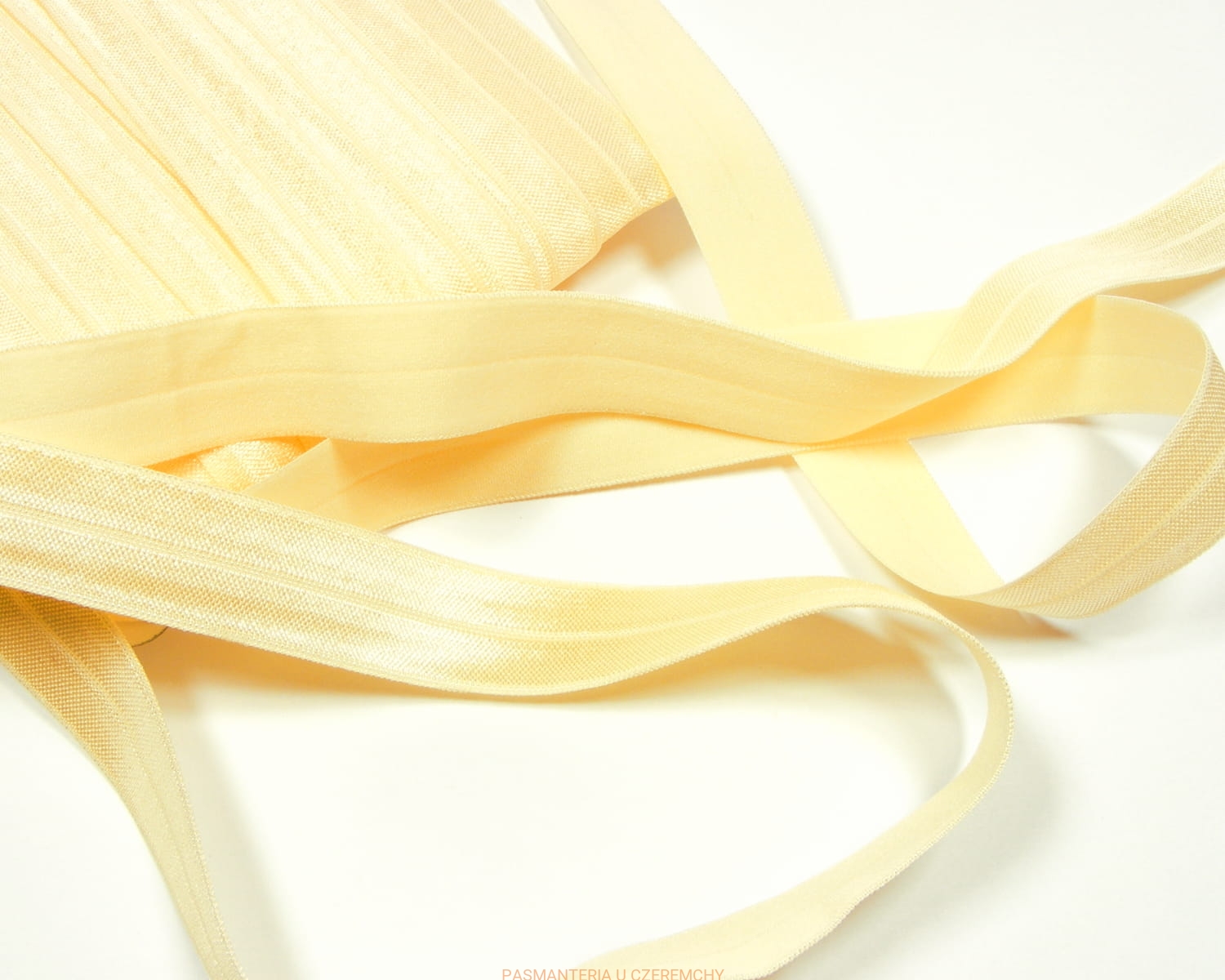 Guma łamana szerokości 18 mm z satynowym połyskiem, w kolorze kremowożółtym. W połowie szerokości delikatnie zaznaczone załamanie ułatwiające złożenie gumy wzdłuż na pół.