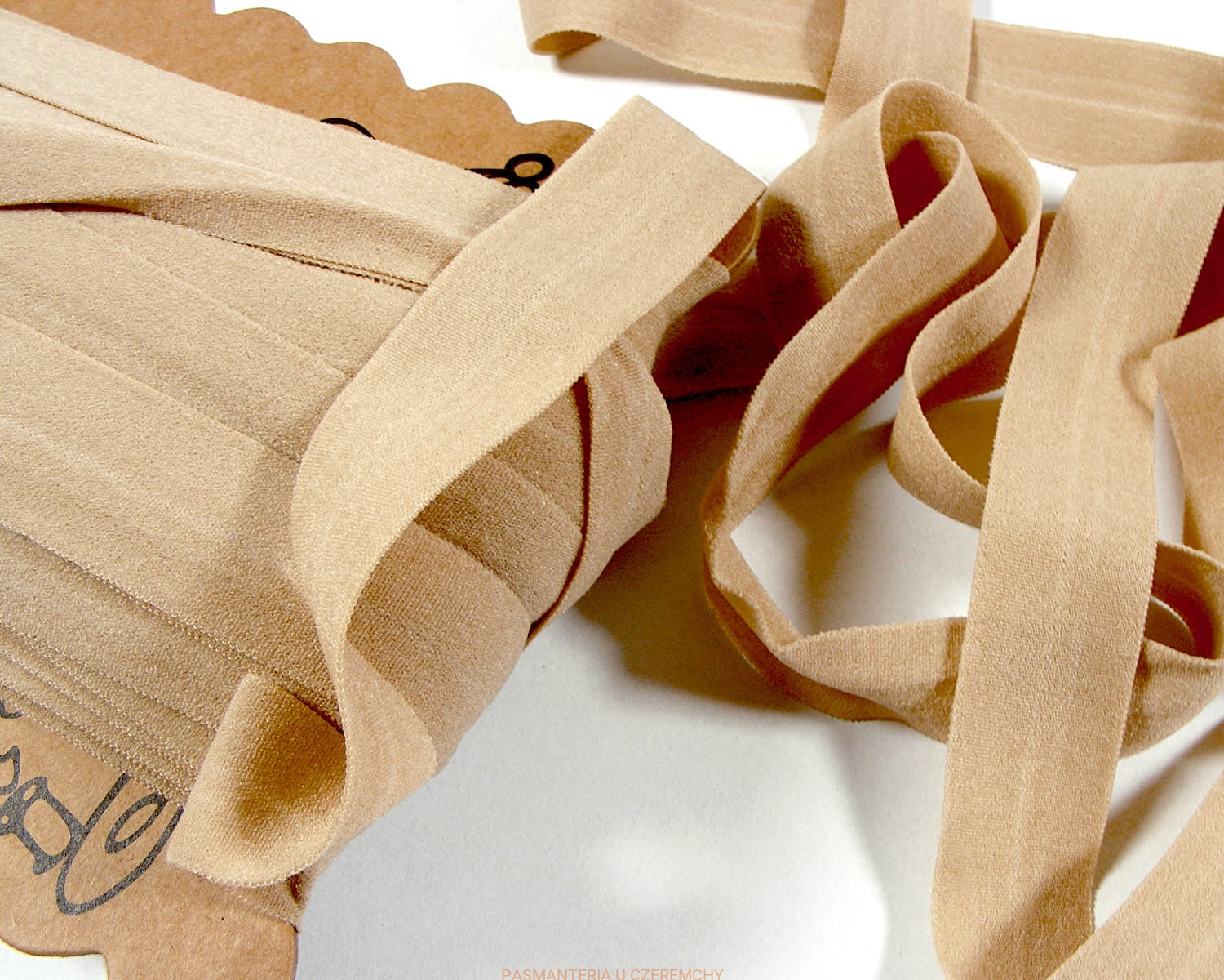 Guma łamana szerokości 21 mm, matowa, delikatna i przyjemna w dotyku, beżowa. W połowie szerokości delikatnie zaznaczone załamanie ułatwiające złożenie gumy wzdłuż na pół.