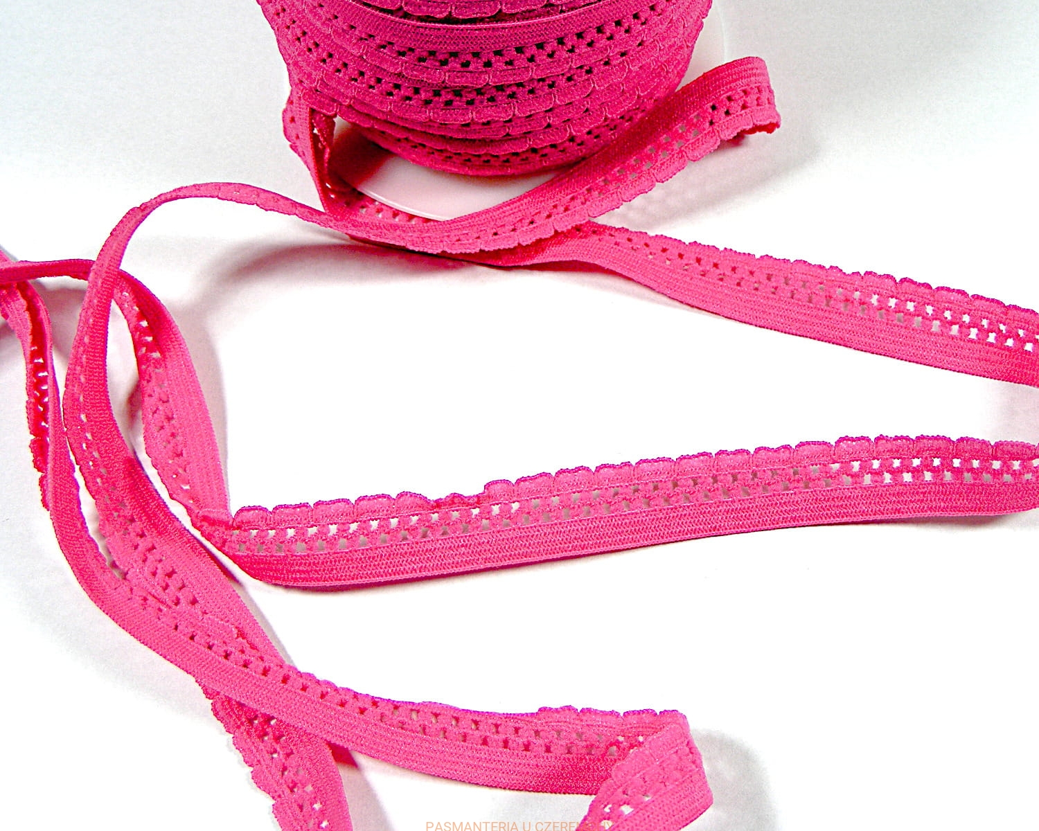 Guma obszywkowa (gumokoronka) płaska, z ozdobnym, ażurowym brzegiem, szerokości 12 mm, różowa.