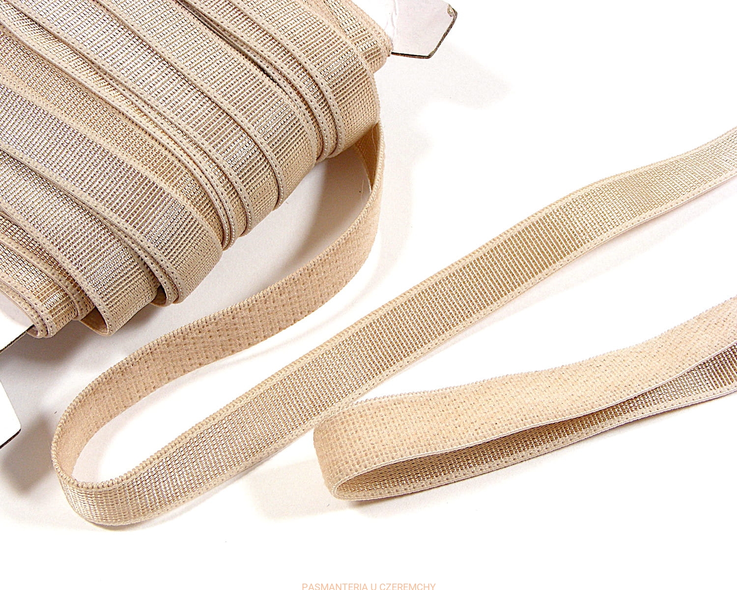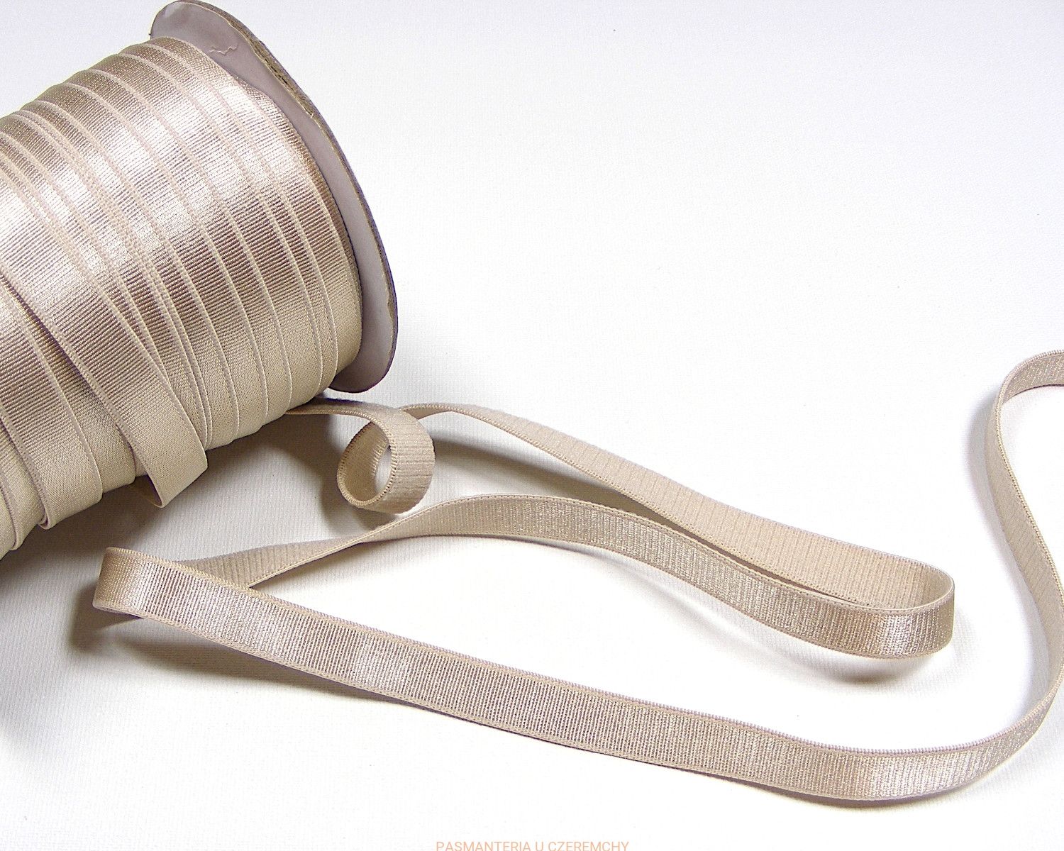 Guma ramiączkowa szerokości 10 mm, beżowa. Z jednej strony jest zupełnie matowa, z drugiej jest połyskująca na niemal całej szerokości.