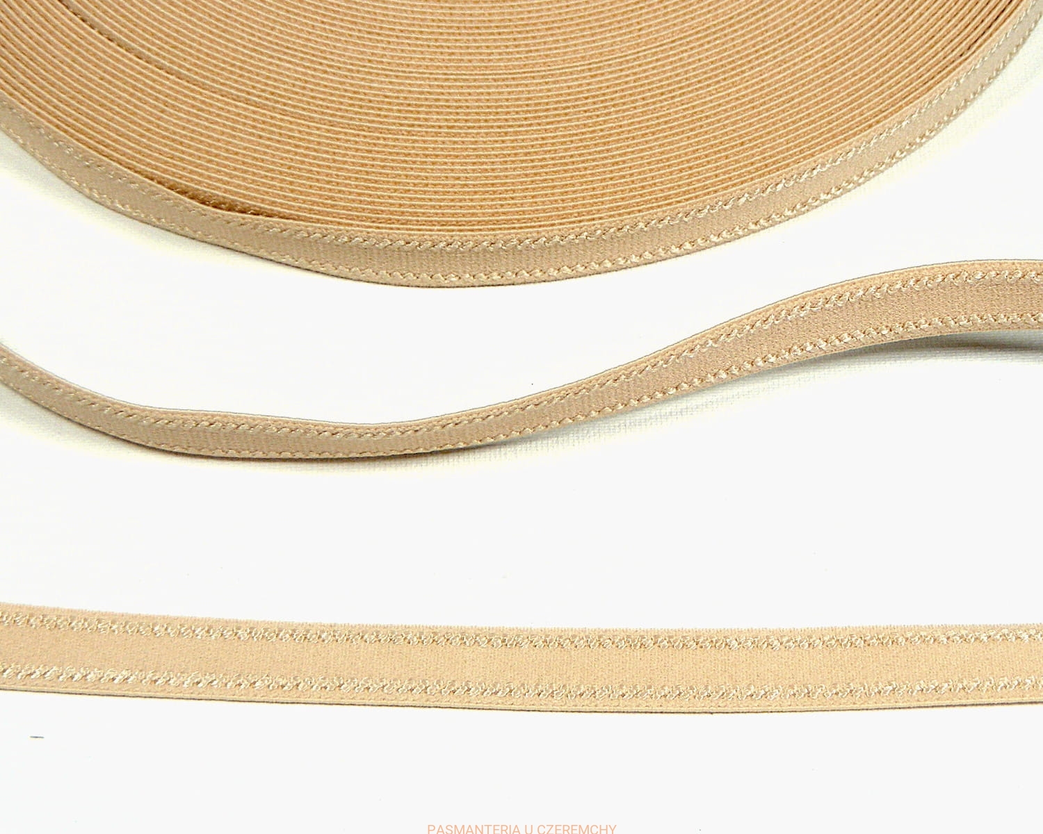 Guma ramiączkowa szerokości 12 mm, beżowa. Z jednej strony jest zupełnie matowa, z drugiej - połyskujące wzorki układają się w paski wzdłuż brzegów gumy.