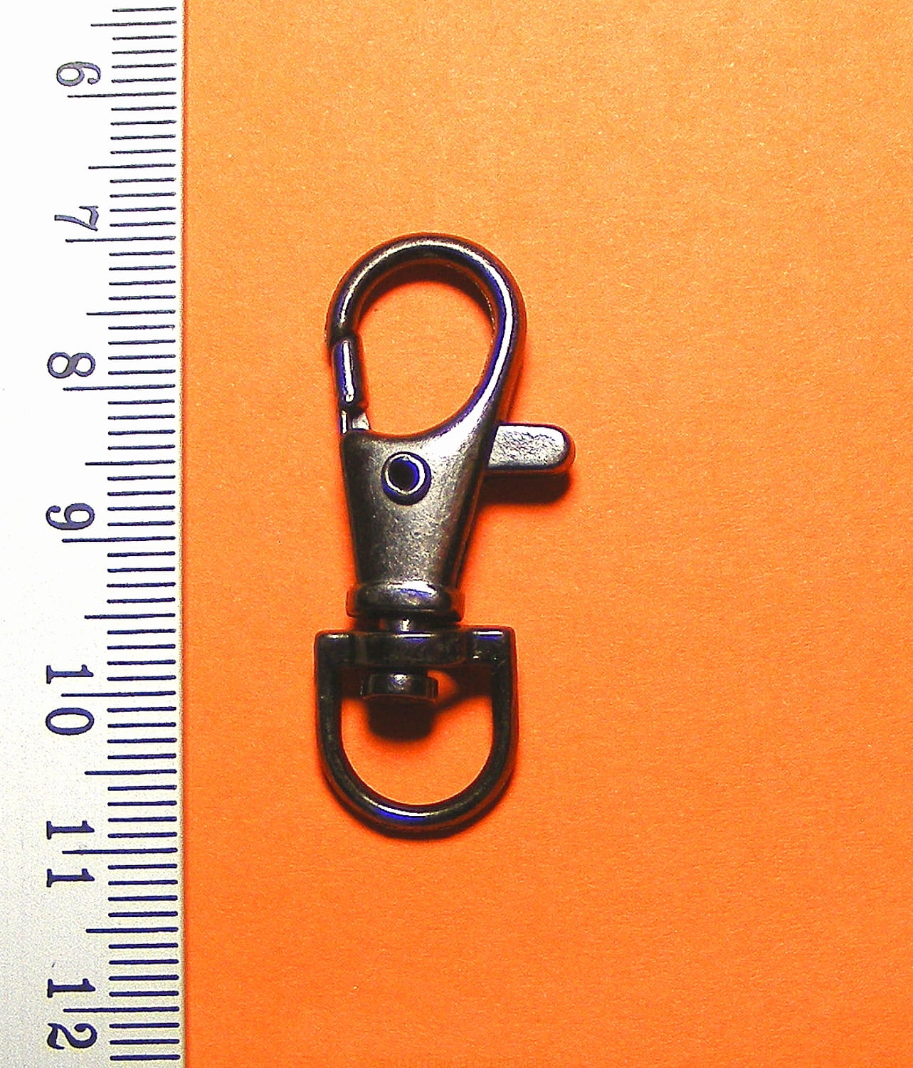 Karabińczyk metalowy obrotowy. Wymiary - ok. 16 x 39 mm. Średnica wewnętrzna półkółka pod karabińczykiem - 10 mm.