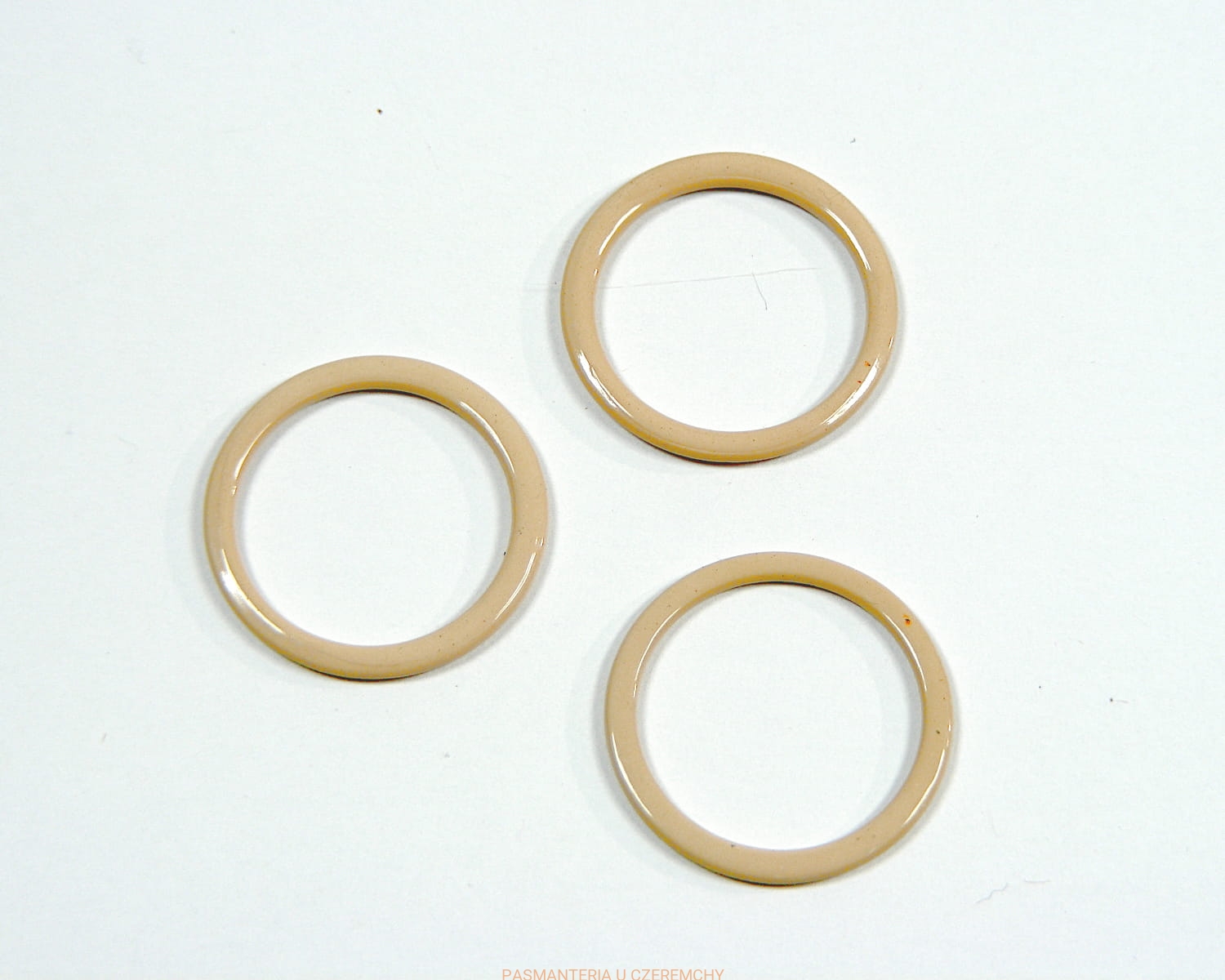 Metalowe, lakierowane kółko bieliźniarskie beżowe, cieliste. Średnica wewnętrzna - ok. 17 mm, zewnętrzna - ok. 22 mm.