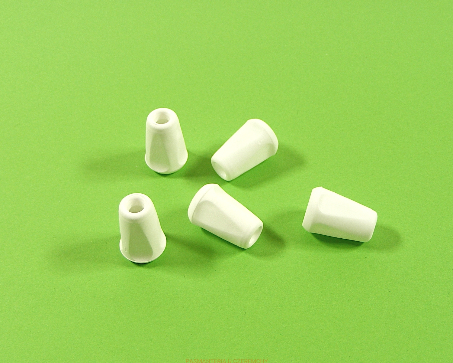 Plastikowe końcówki do zakładania na supełki na końcach sznurka i zabezpieczania ich w ten sposób przed rozwlekaniem, a ponadto poprawiające wygląd odzieży i akcesoriów, w których sznurek jest stosowany. Wysokość - ok. 1,7 cm, szerokość maksymalna - ok. 1,2 cm. Średnica otworu na sznurek - ok. 4 mm.