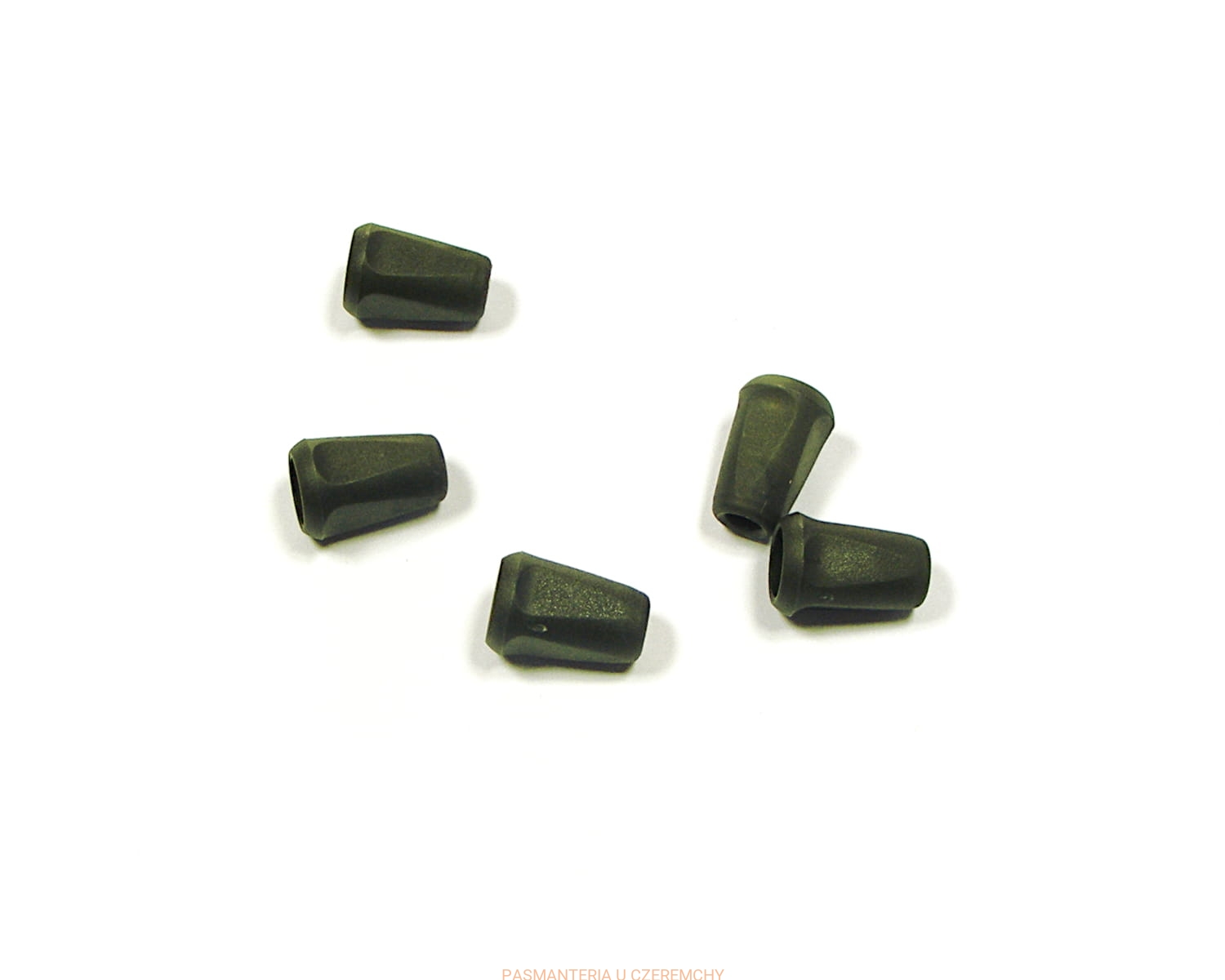 Plastikowe końcówki do zakładania na supełki na końcach sznurka i zabezpieczania ich w ten sposób przed rozwlekaniem, a ponadto poprawiające wygląd odzieży i akcesoriów, w których sznurek jest stosowany. Wysokość - ok. 1,7 cm, szerokość maksymalna - ok. 1,2 cm. Średnica otworu na sznurek - ok. 4 mm.