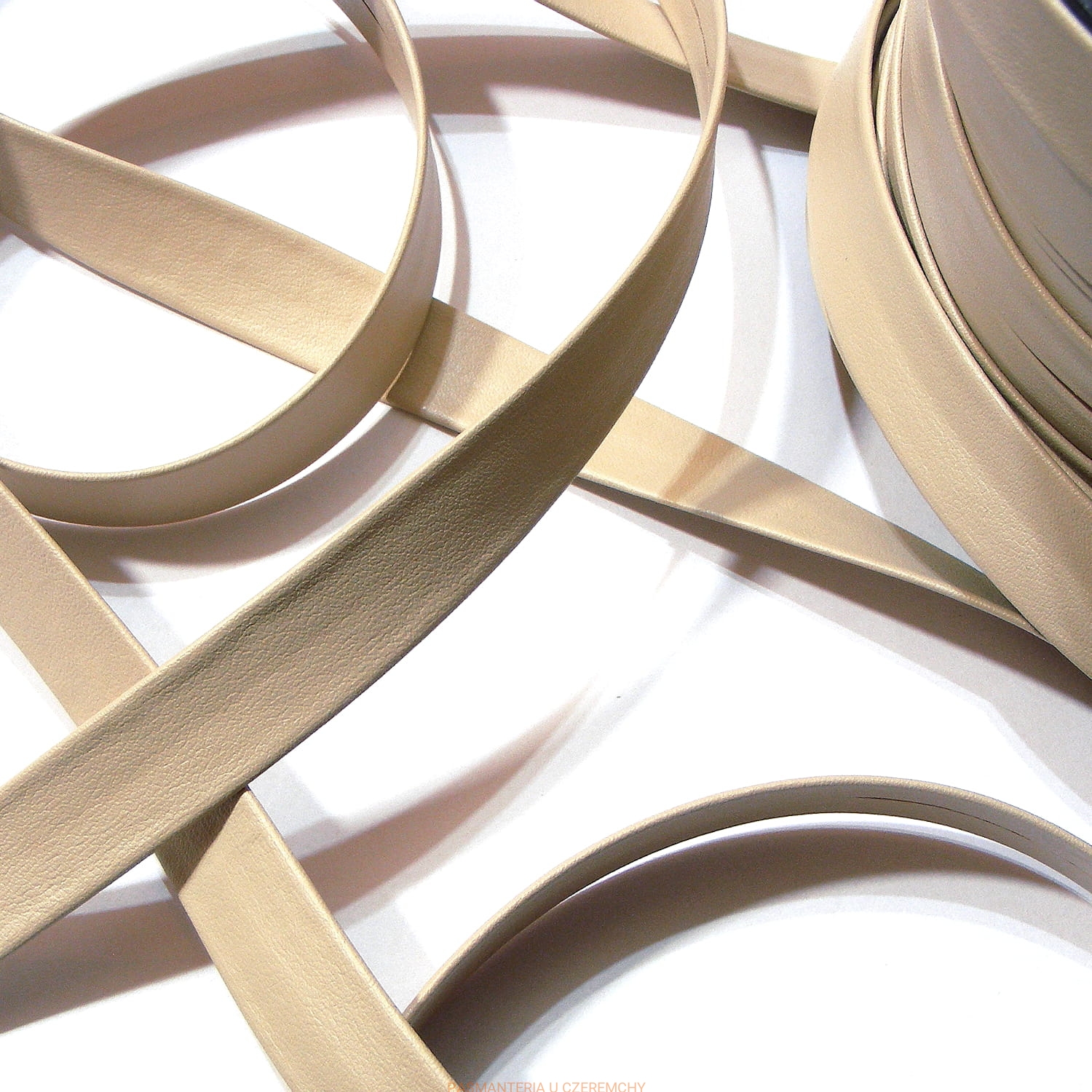 Lamówka zaprasowana i sklejona, bez surowych brzegów, szerokości 15 mm z eko-skóry, matowa, w kolorze jasnobeżowym. Opakowanie 20 metrów.
