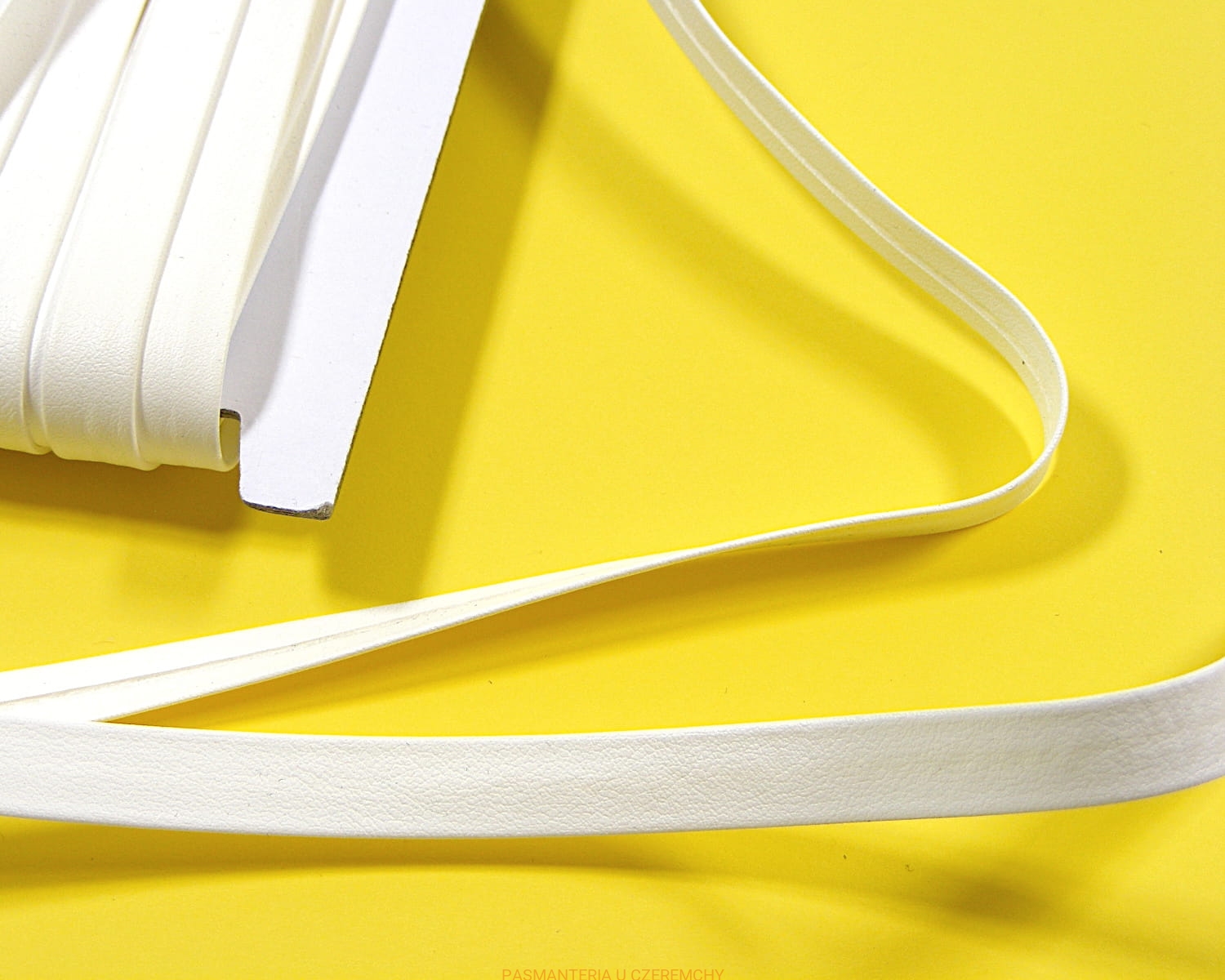 Lamówka zaprasowana i sklejona, bez surowych brzegów, szerokości 15 mm z eko-skóry, biała, matowa. Opakowanie 20 metrów.