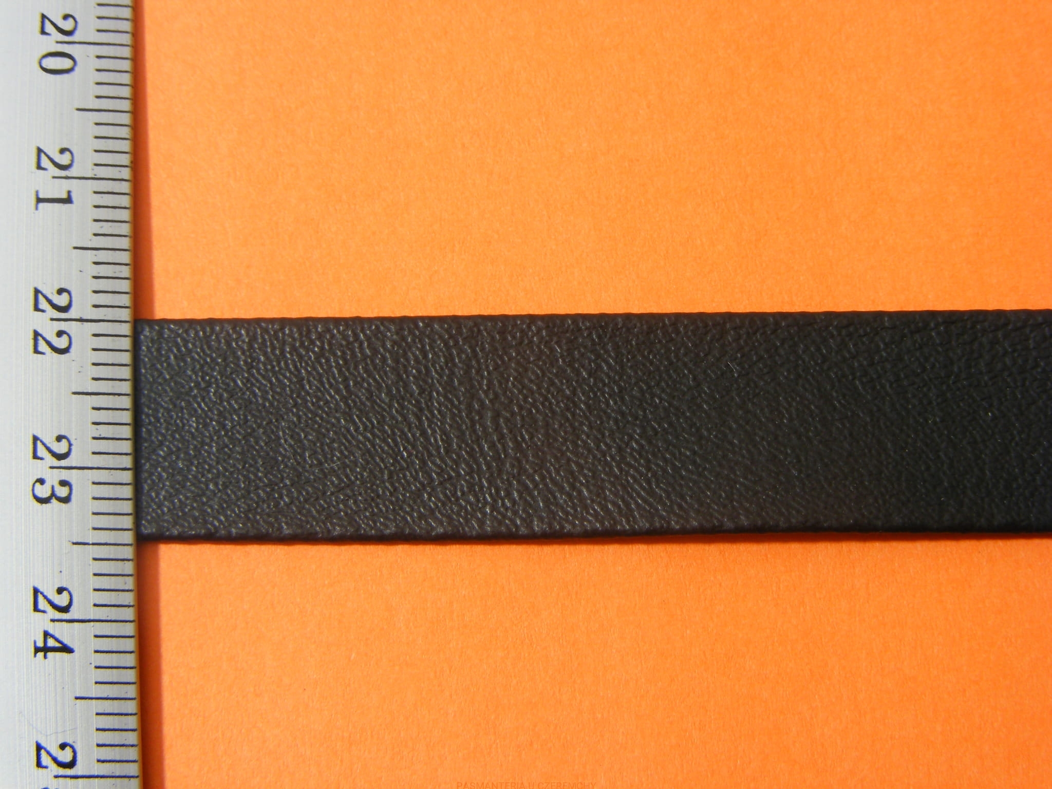 Lamówka zaprasowana i sklejona, bez surowych brzegów, szerokości 15 mm z eko-skóry, czarna, matowa.