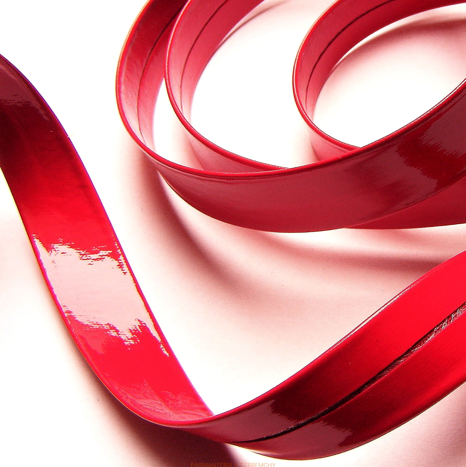 Lamówka zaprasowana i sklejona, bez surowych brzegów, szerokości 15 mm z eko-skóry, czerwona, mocno błyszcząca /lakierowana/, opakowanie 20 metrów.