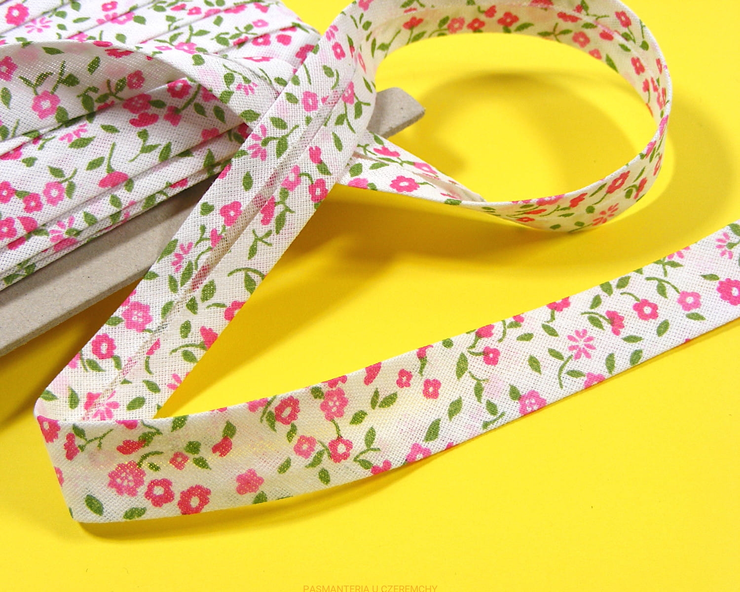 Lamówka bawełniana ze skosu, w różowe kwiatki i zielone listki na białym tle, szerokości 18 mm. Opakowanie 20 metrów.