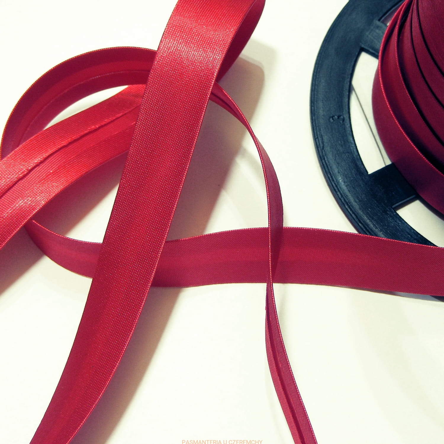 Lamówka atłasowa zaprasowana, szerokości 15 mm, w kolorze czerwonym /klik/. Opakowanie 20 metrów.