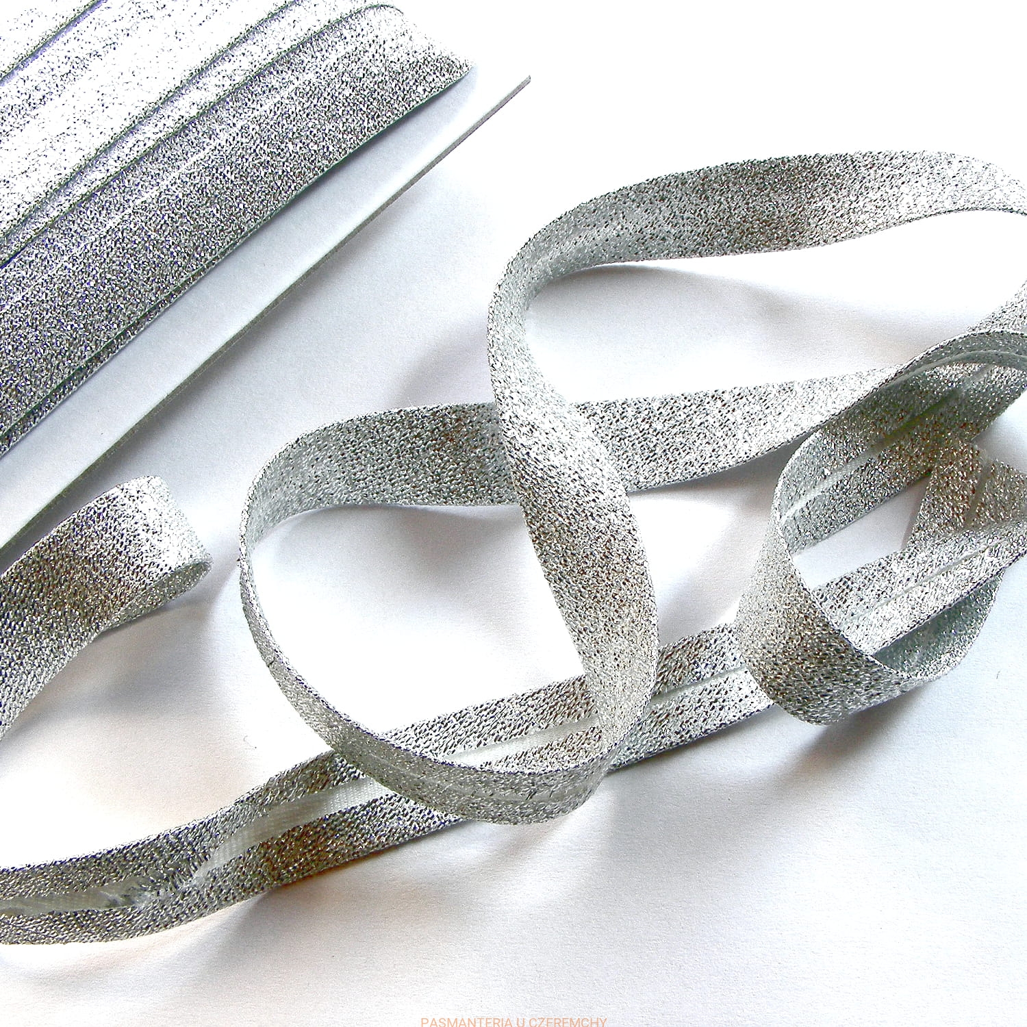 Lamówka brokatowa zaprasowana, szerokości 15 mm, w kolorze srebrnym, mocno się skrząca. Opakowanie 20 metrów.