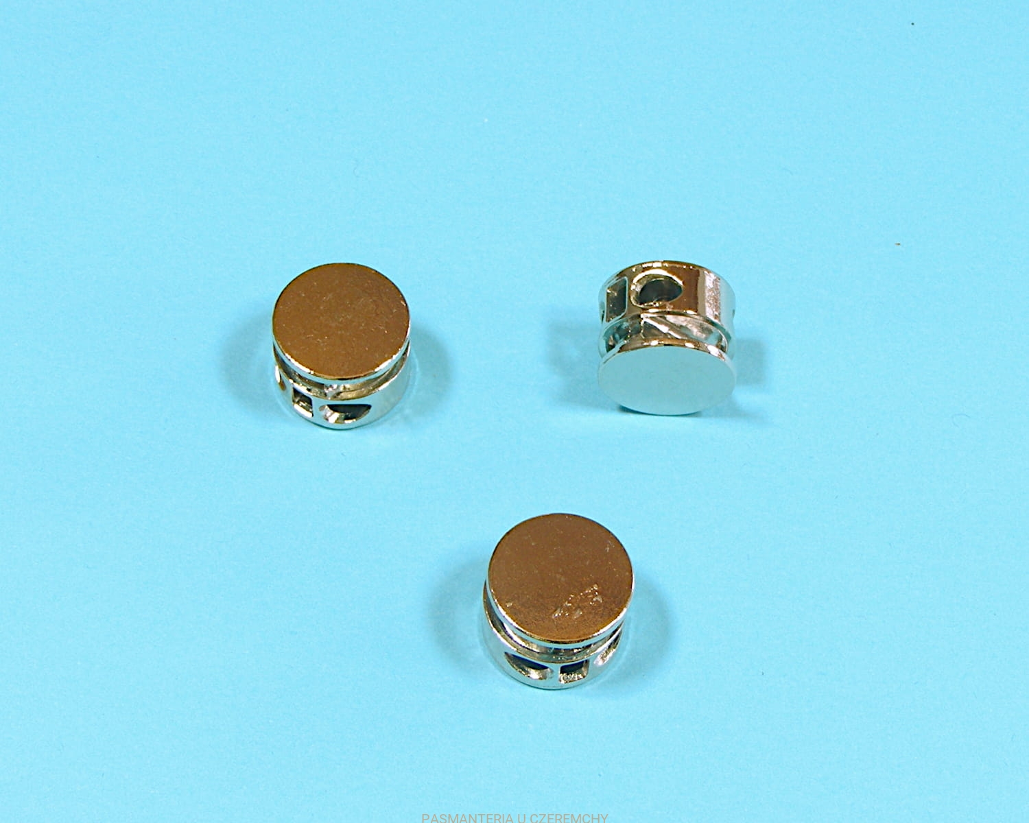 Metalowy stoper do regulowania długości /obwodu/ sznurka. Kolor srebrny, błyszczący.