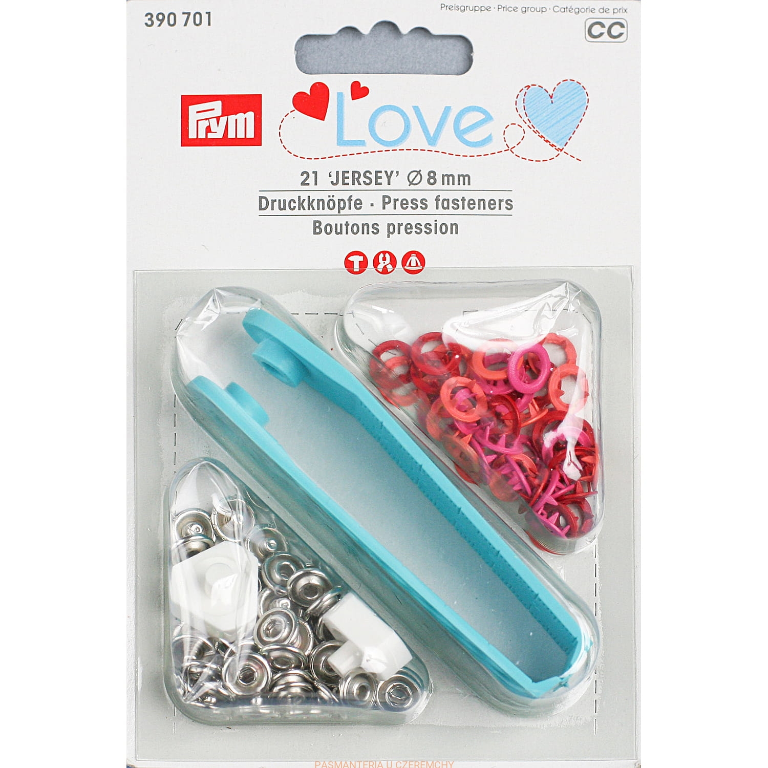 Zestaw zawiera 21 kompletów zatrzasków, które można nabijać młotkiem lub przy użyciu napownic PRYM 390 900, 390 901 oraz trójnoga 673 130. W zestawie znajduje się przyrząd ułatwiający ich nabijanie oraz końcówki do napownicy lub trójnoga.