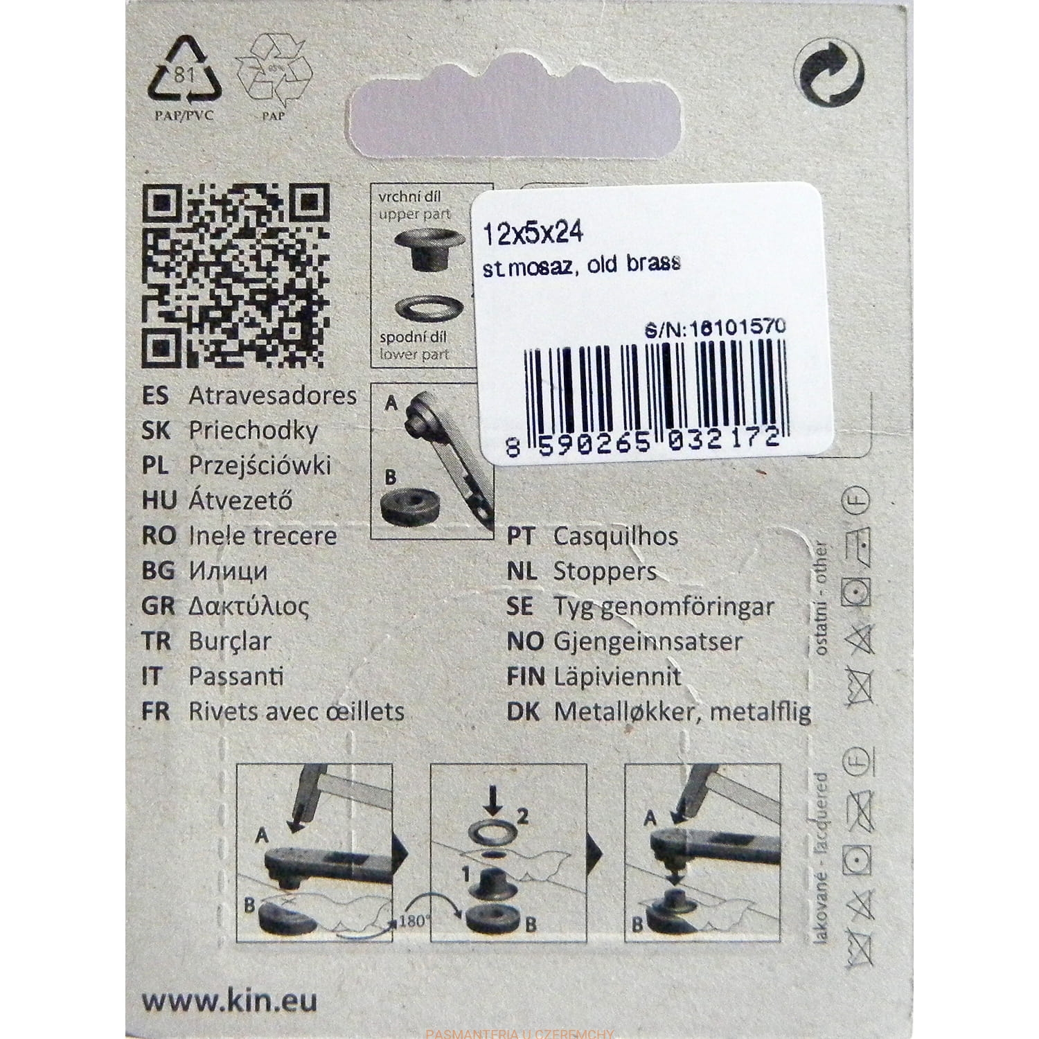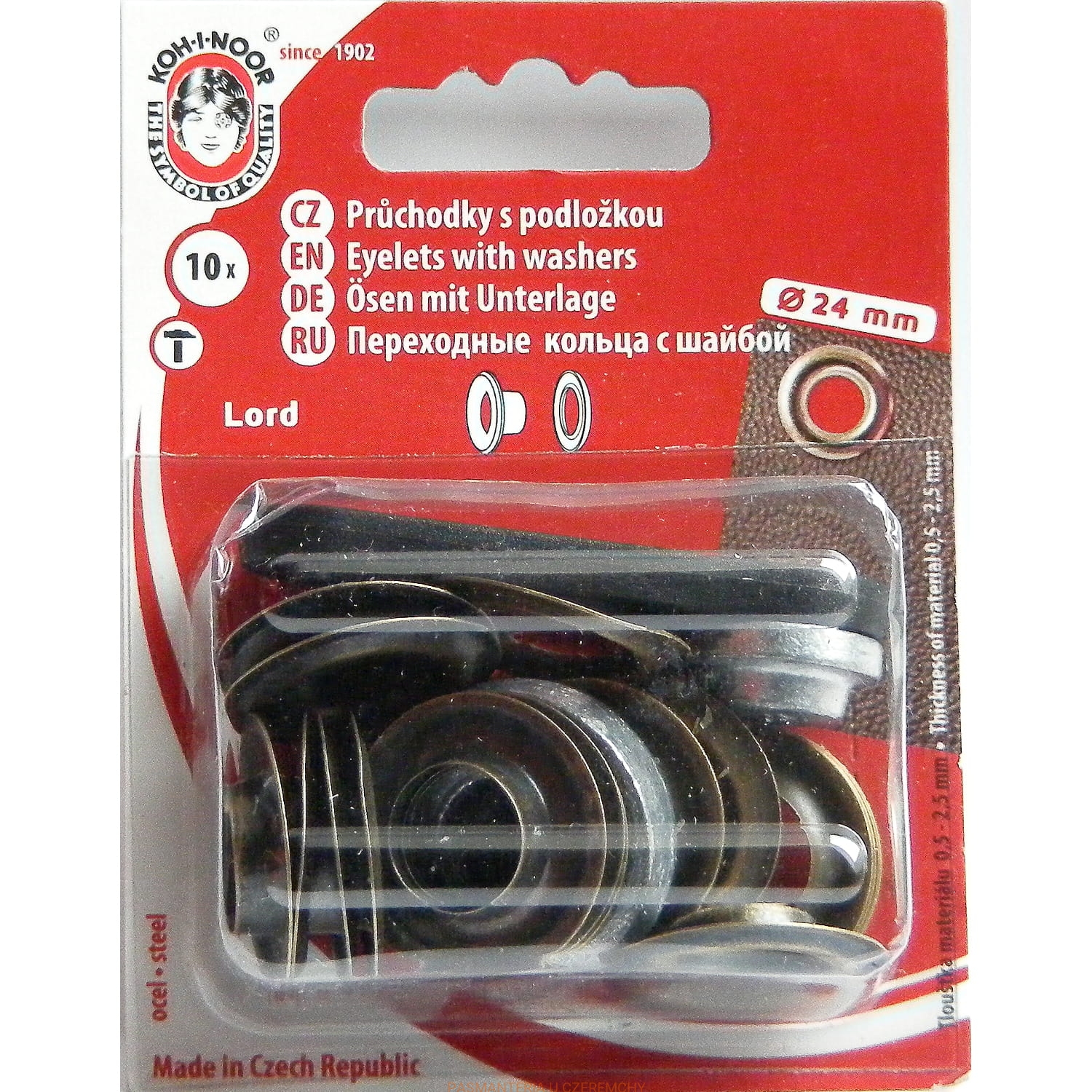 Opakowanie zawiera 10 szt. oczek z podkładkami oraz przyrząd do wycinania dziurek pod oczko w materiale i umożliwiający nabicie oczka młotkiem.