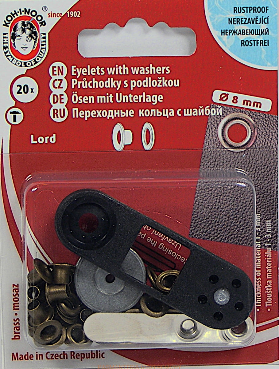 Opakowanie zawiera 20 szt. oczek z podkładkami oraz przyrząd do wycinania dziurek pod oczko w materiale i umożliwiający nabicie oczka młotkiem.