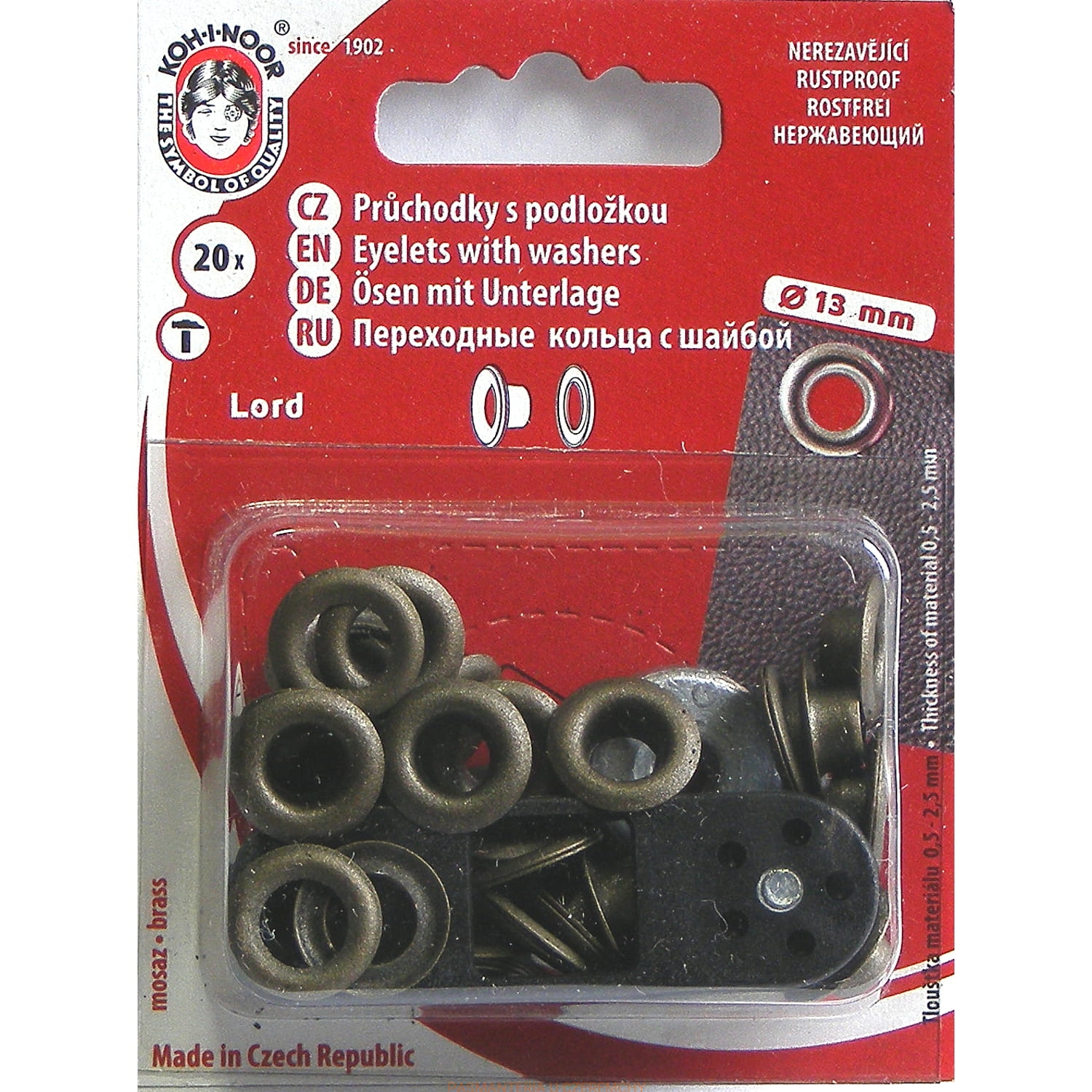 Opakowanie zawiera 20 szt. oczek z podkładkami oraz przyrząd do wycinania dziurek pod oczko w materiale i umożliwiający nabicie oczka młotkiem.