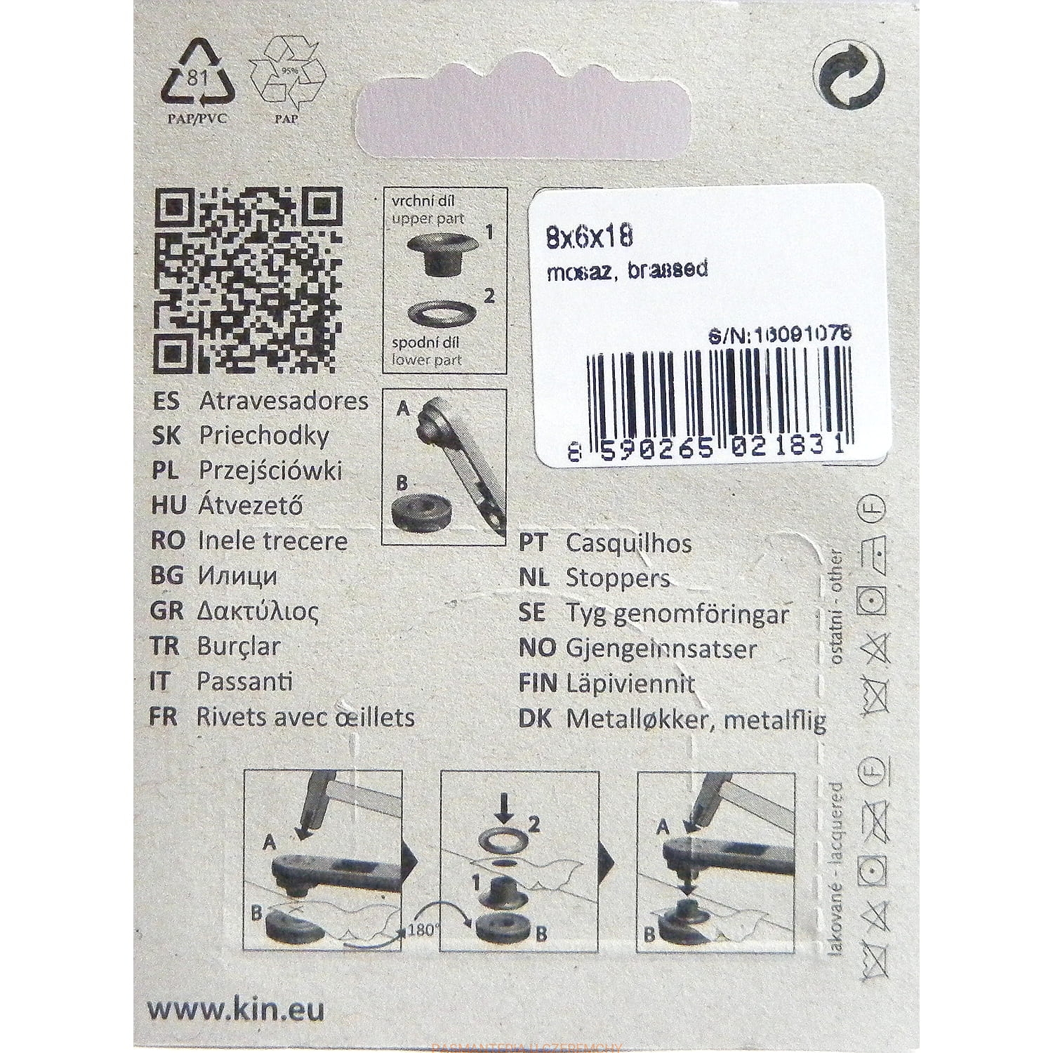 Opakowanie zawiera 10 szt. oczek z podkładkami oraz przyrząd do wycinania dziurek pod oczko w materiale i umożliwiający nabicie oczka młotkiem.
