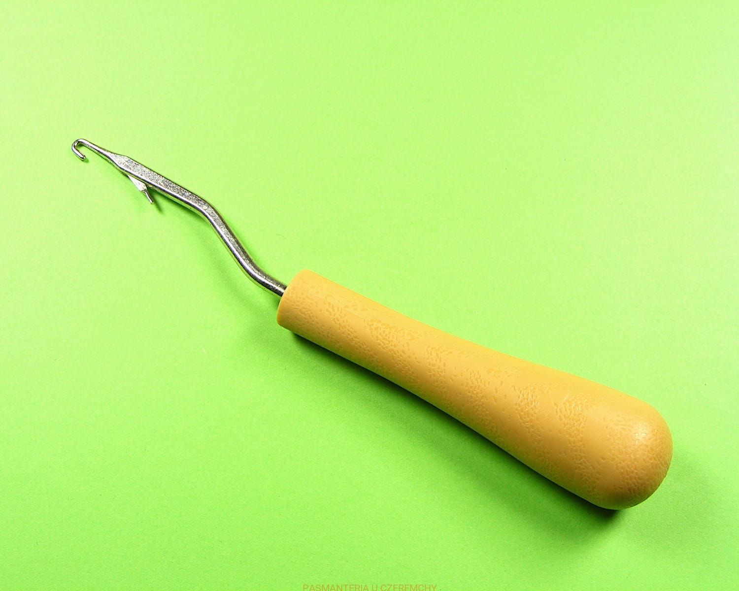 Haczyk z ruchomą klapką - przyrząd do łapania oczek w grubszych dzianinach.