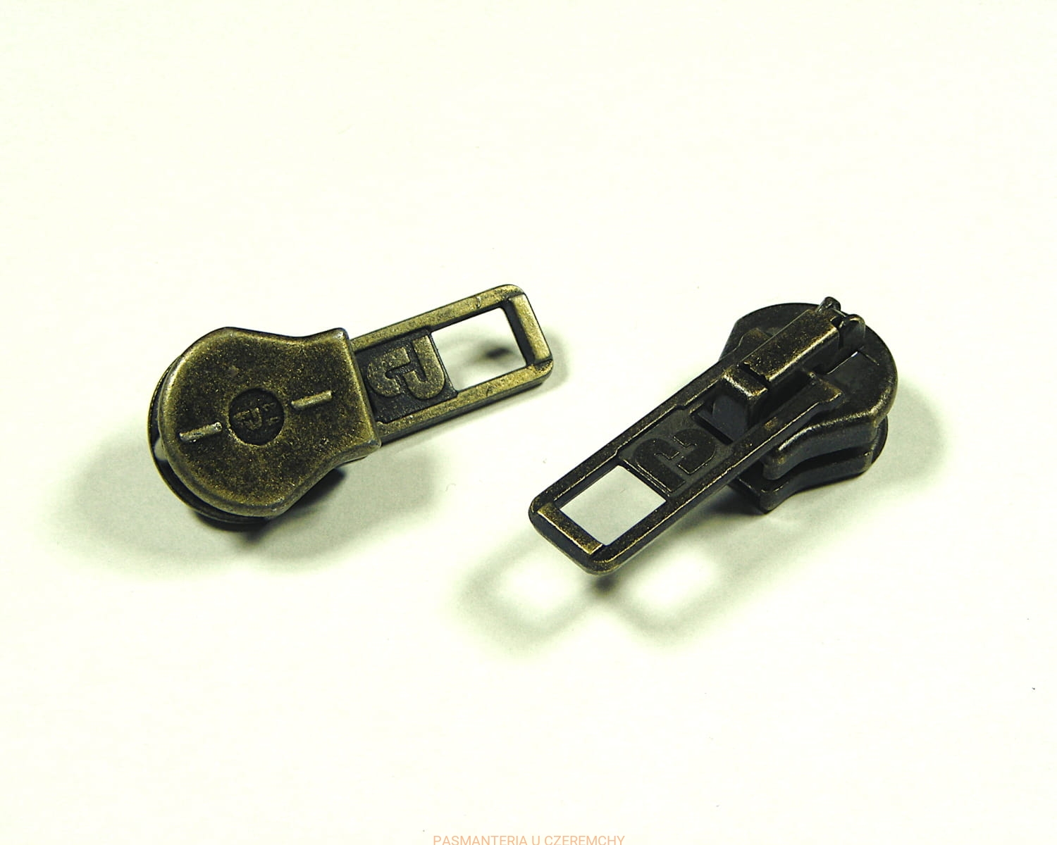 Suwak do zamków kostkowych - grubszych /szerokość taśmy ząbków po zapięciu zamka - ok. 8,6 mm/. Kolor - mosiądz oksydowany.
