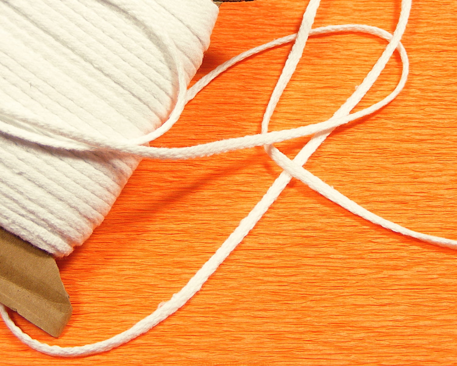 Pleciony sznurek bawełniany szerokości 4 mm, na przekroju płaski, biały.