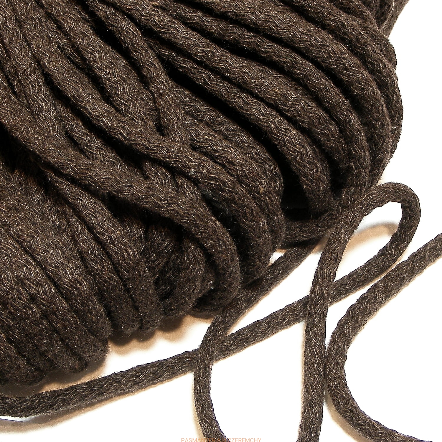 Sznurek odzieżowy o okrągłym przekroju, śr. 5 mm, bawełniany, z rdzeniem, w kolorze ciemnobrązowym. Motek 20 mb.