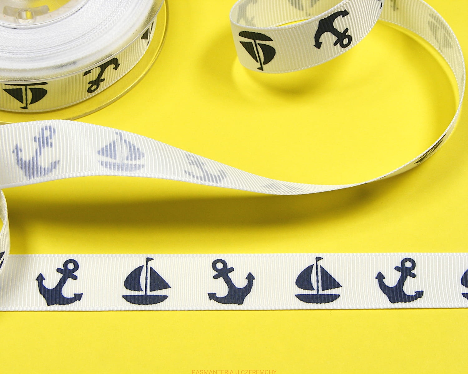 tasiemka rypsowa drukowana 16 mm - kotwice i żaglówki, rolka 9,1 m