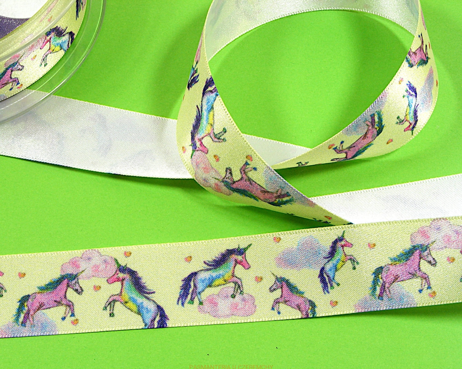 tasiemka satynowa 25 mm drukowana - jednorożce /wstążka/