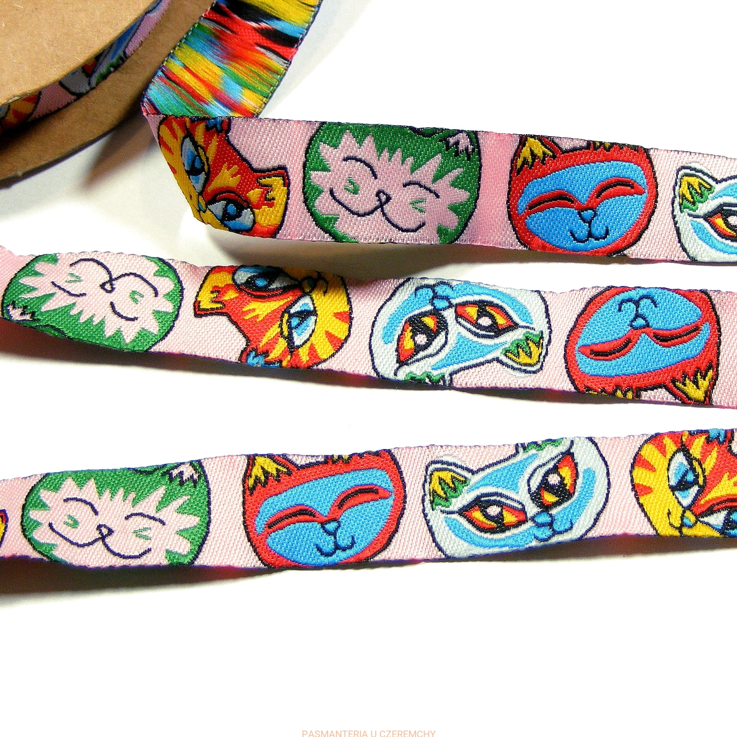 Tasiemka żakardowa szerokości 15 mm w różnokolorowe pyszczki kotów na różowym tle.