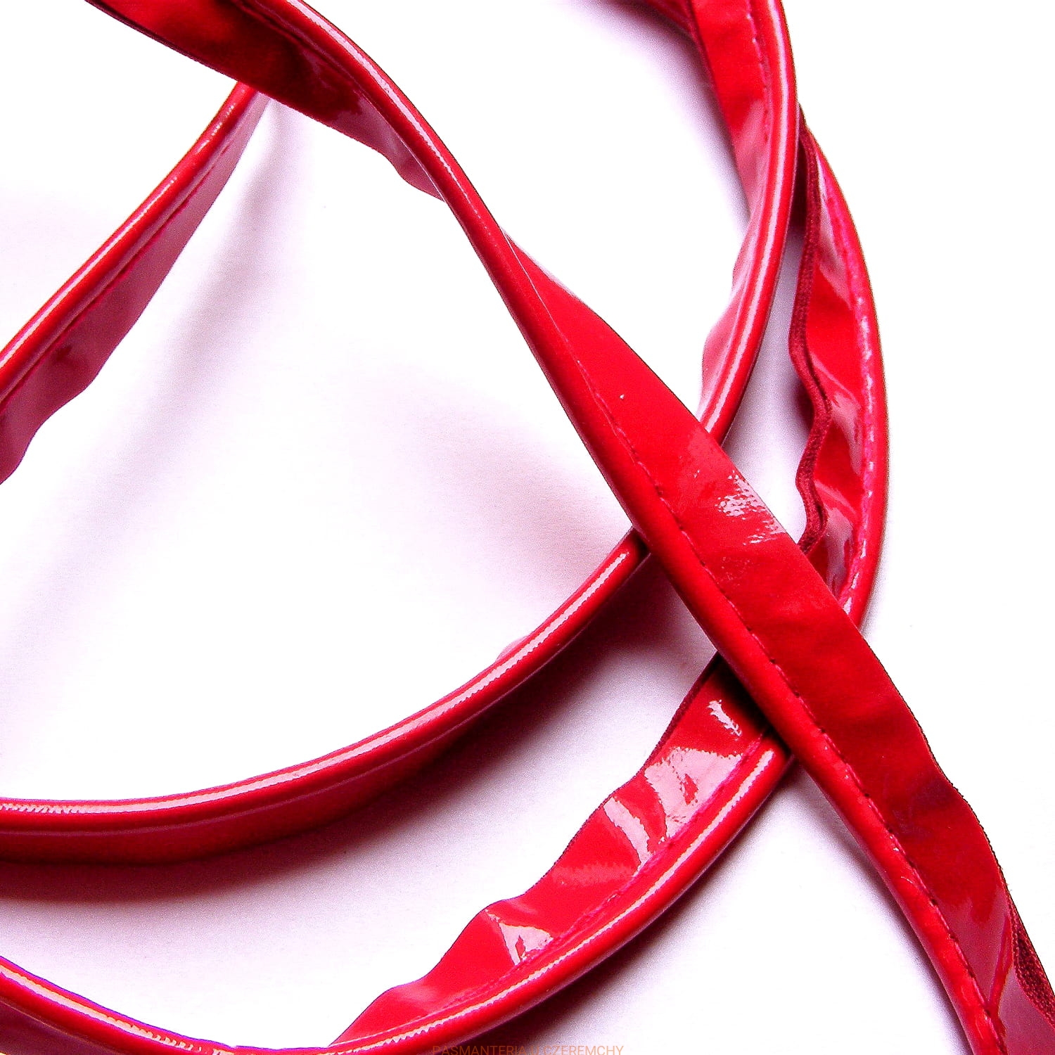 Wypustka z imitacji skóry /eko-skóra, skaj/ 11 mm czerwona, mocno błyszcząca /lakierowana/. Opakowanie 20 metrów.