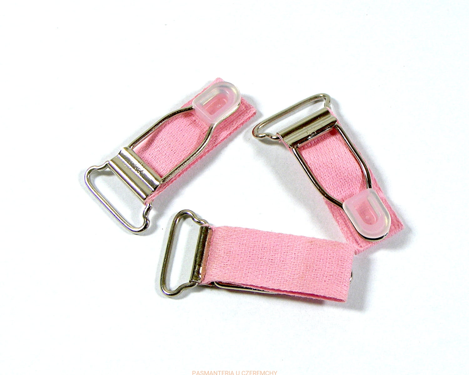 Metalowa żabka do zapinania pończoch. Kolor metalu - srebrny, tasiemki z blokadą - różowy. Szerokość przelotki - 18 mm.