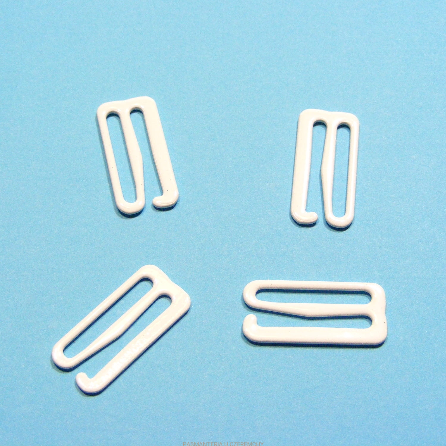 Metalowy zaczep do ramiączek, lakierowany, w kolorze białym. Szerokość przelotki - 20 mm.