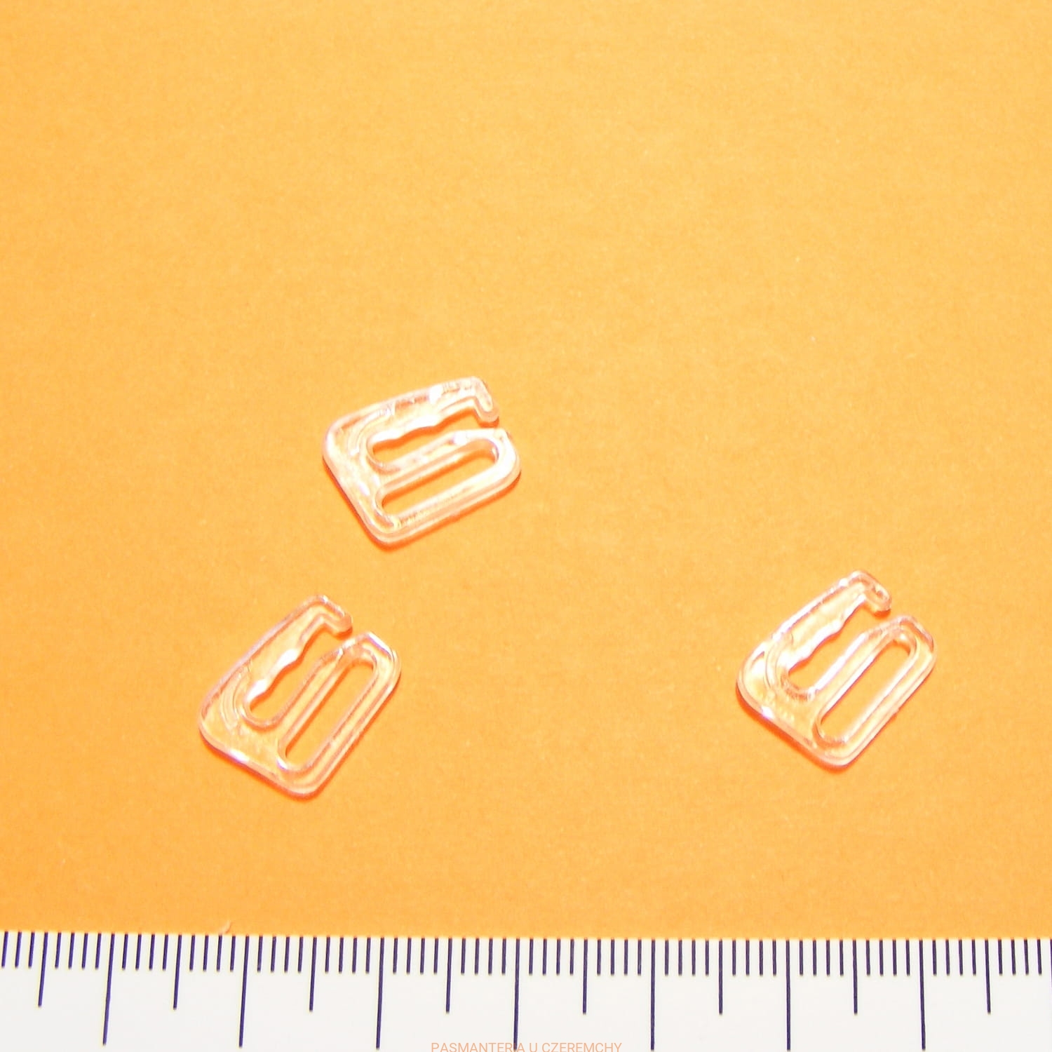 Plastikowy zaczep do ramiączek, bezbarwny. Szerokość przelotki - 15 mm.