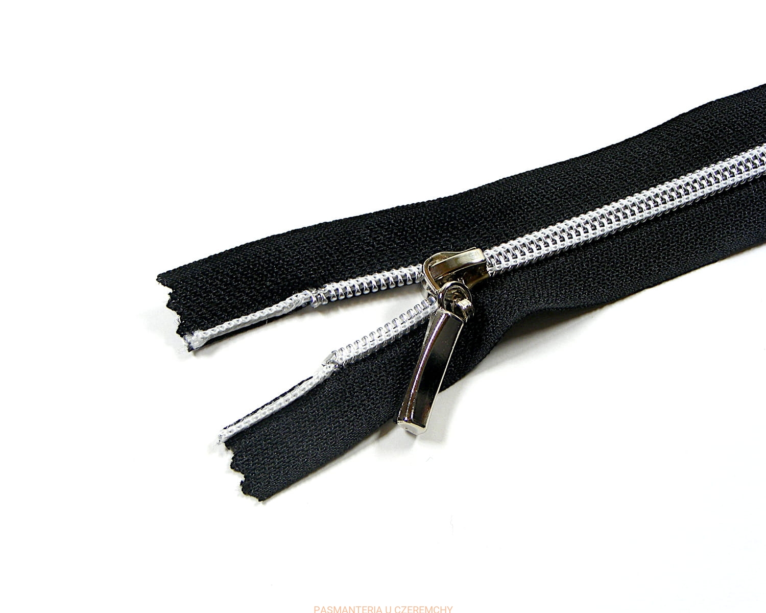 Zamek nierozdzielczy plastikowy spirala 5 dł. 14 cm. Kolor czarny. Spirala ząbków zamka jest metalizowana, do złudzenia przypomina srebrny drucik. Jest przyszyta do taśmy zamka białą nitką.