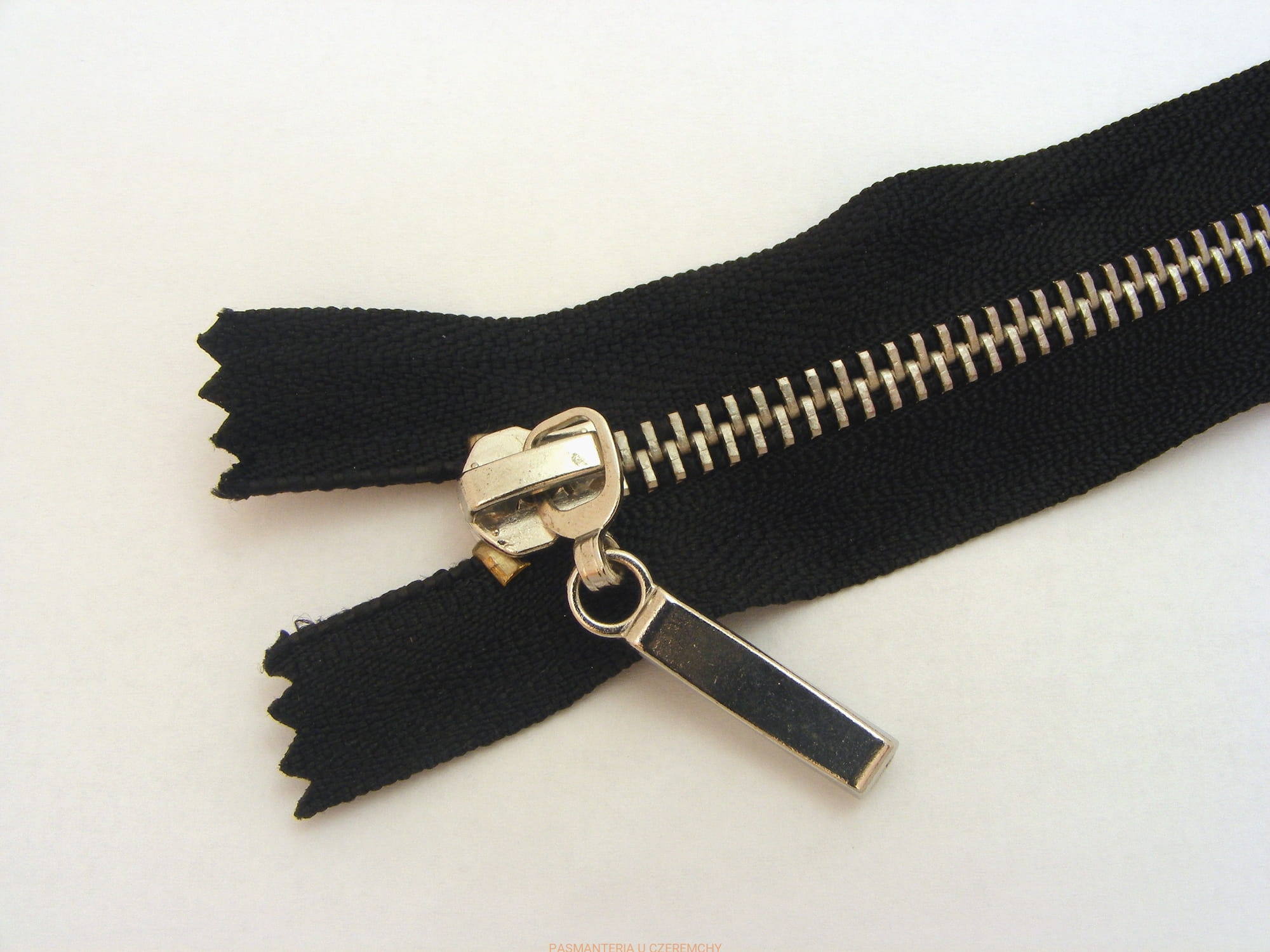 Zamek metalowy /nikiel/, dł. 16 cm. Szerokość zapiętej taśmy z ząbkami - ok. 6 mm.