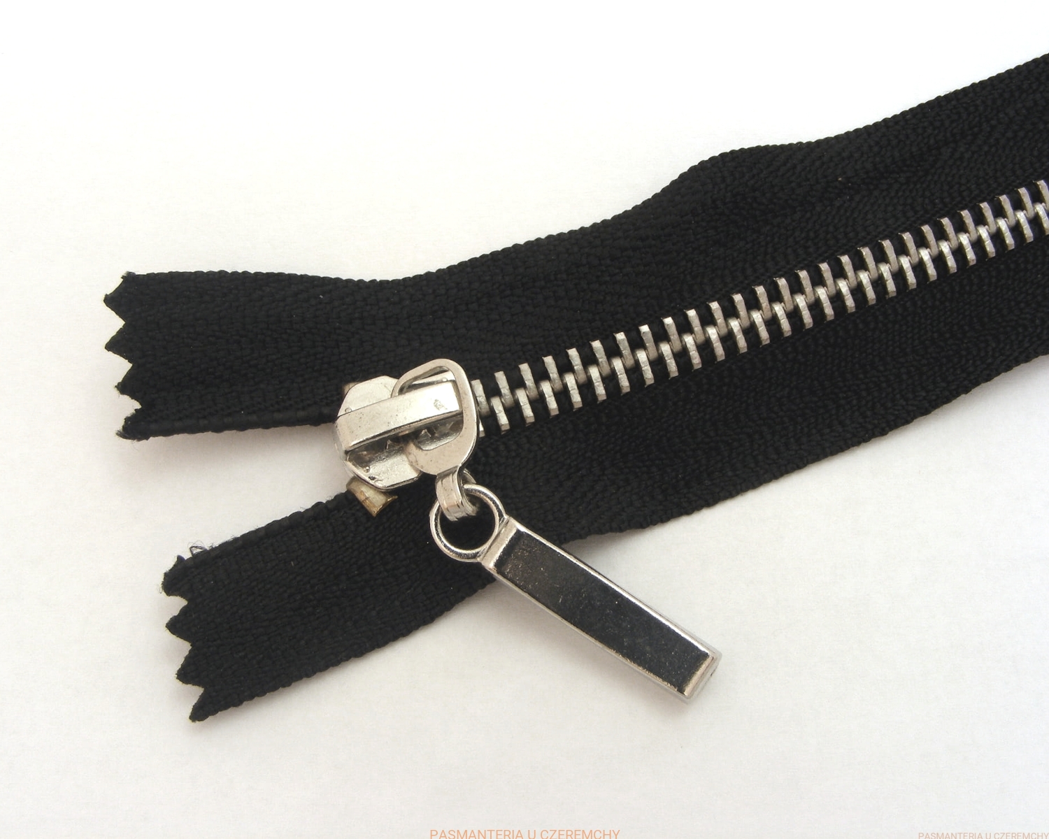 Zamek metalowy, dł. 18 cm. Kolor części metalowych - srebrny. Szerokość zapiętej taśmy z ząbkami - ok. 4 mm.