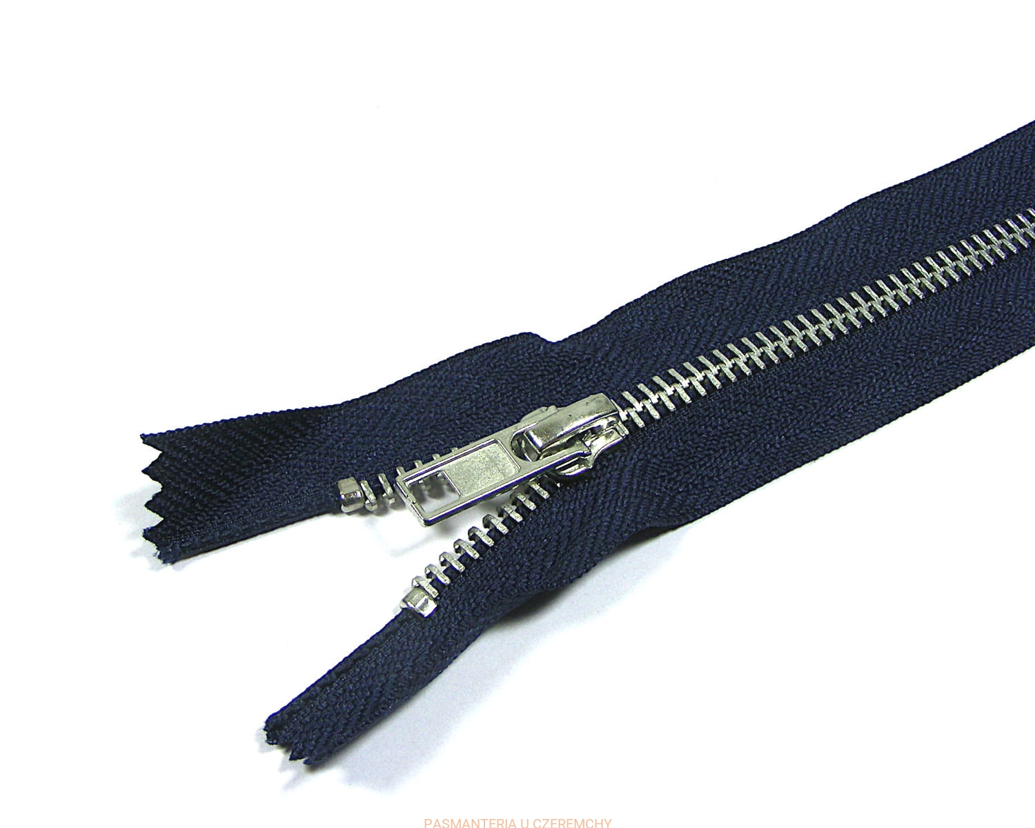 Zamek metalowy dł. 18 cm w kolorze granatowym. Kolor ząbków - srebrny.
