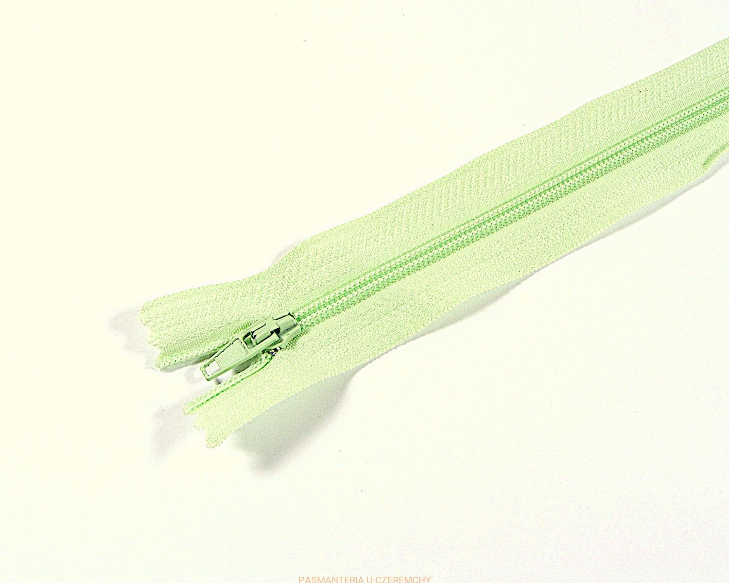 Zamek nierozdzielczy spirala rozm. 3, 18 cm długości, seledynowy, nadający się do spódnic, spodni i innych wyrobów z materiałów lekkich oraz średniej grubości.