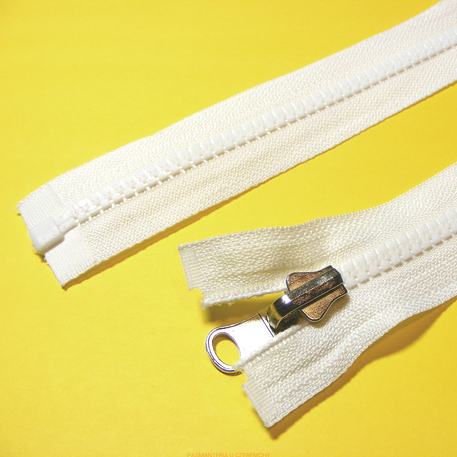 Zamek rozdzielczy dwustronny /obrotowy/ typu kostka /5 mm/ 180 cm, biały, z niklowanym /srebrnym/ suwakiem.