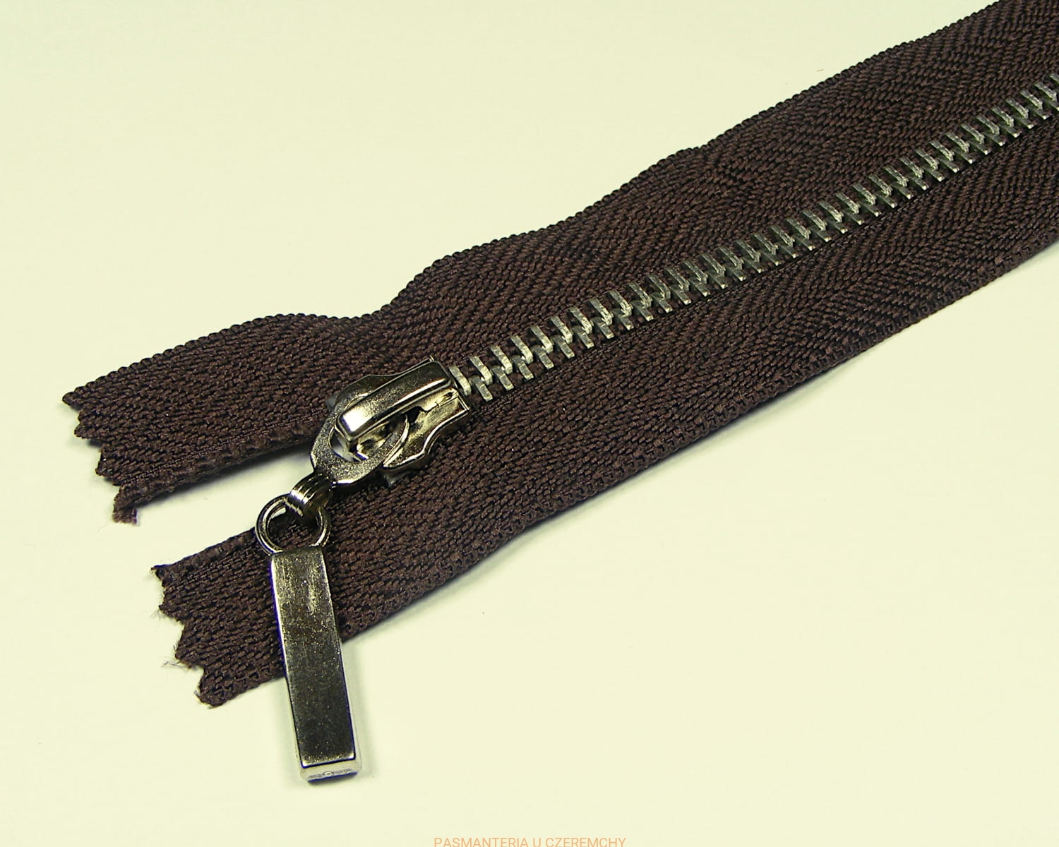 Zamek metalowy /nikiel/, dł. 20 cm, ciemnobrązowy /klik/. Szerokość zapiętej taśmy z ząbkami - ok. 6 mm.