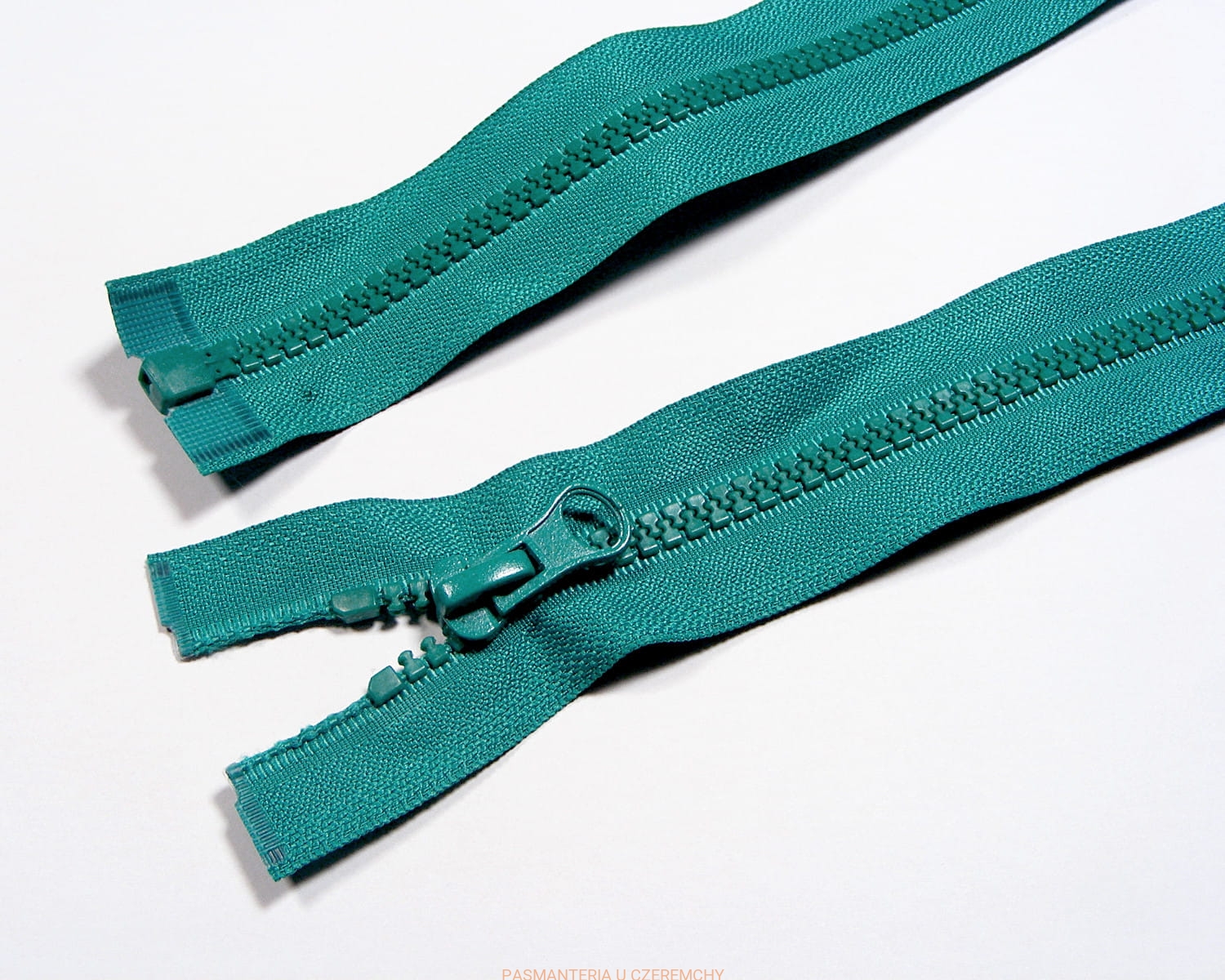 Zamek rozdzielczy typu kostka rozm. 5, dł. 45 cm, w intensywnym, zielononiebieskim kolorze.