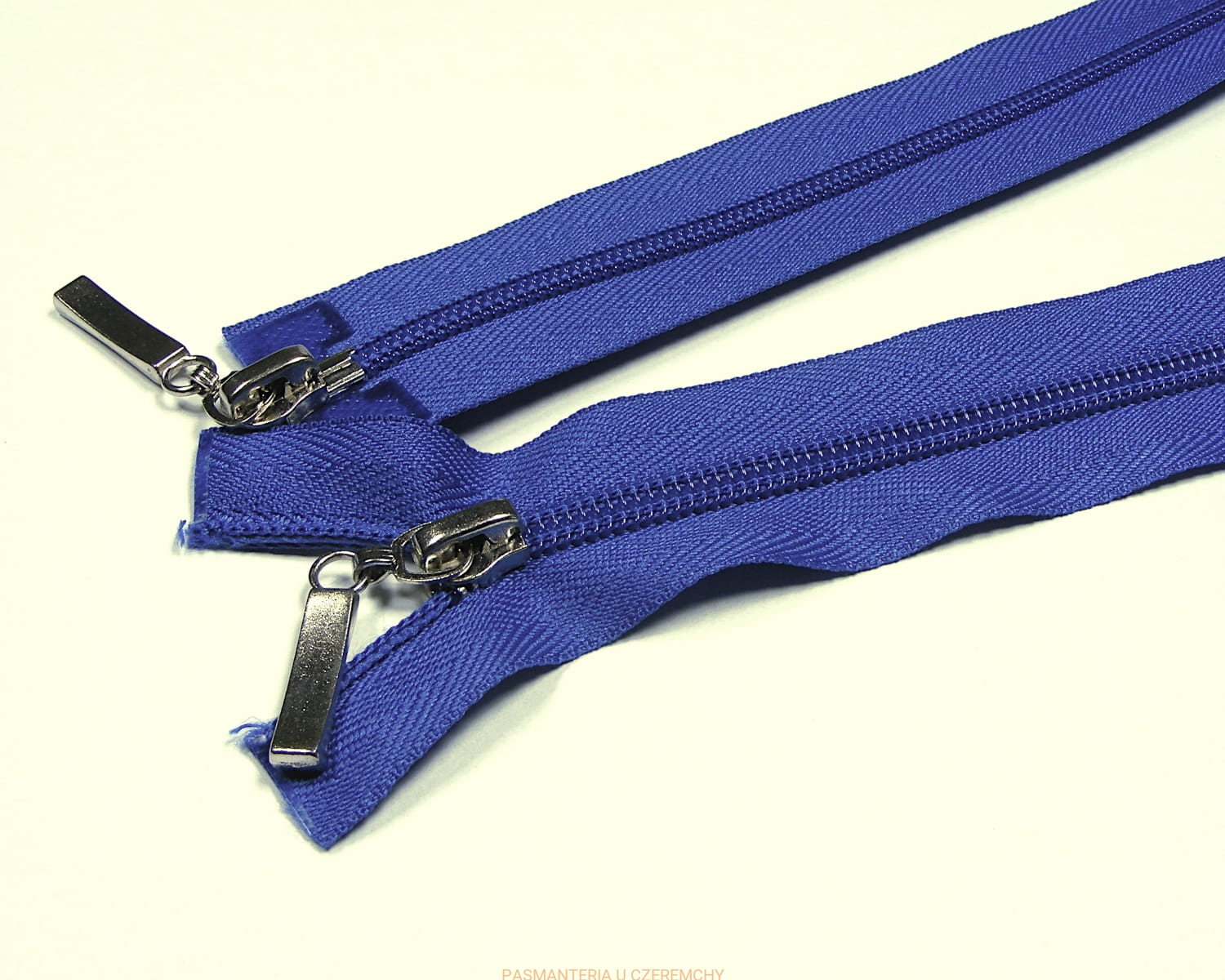 Zamek rozdzielczy dwusuwakowy plastikowy spirala 5, długości 80 cm, chabrowy /klik/. Kolor suwaków - srebrny.