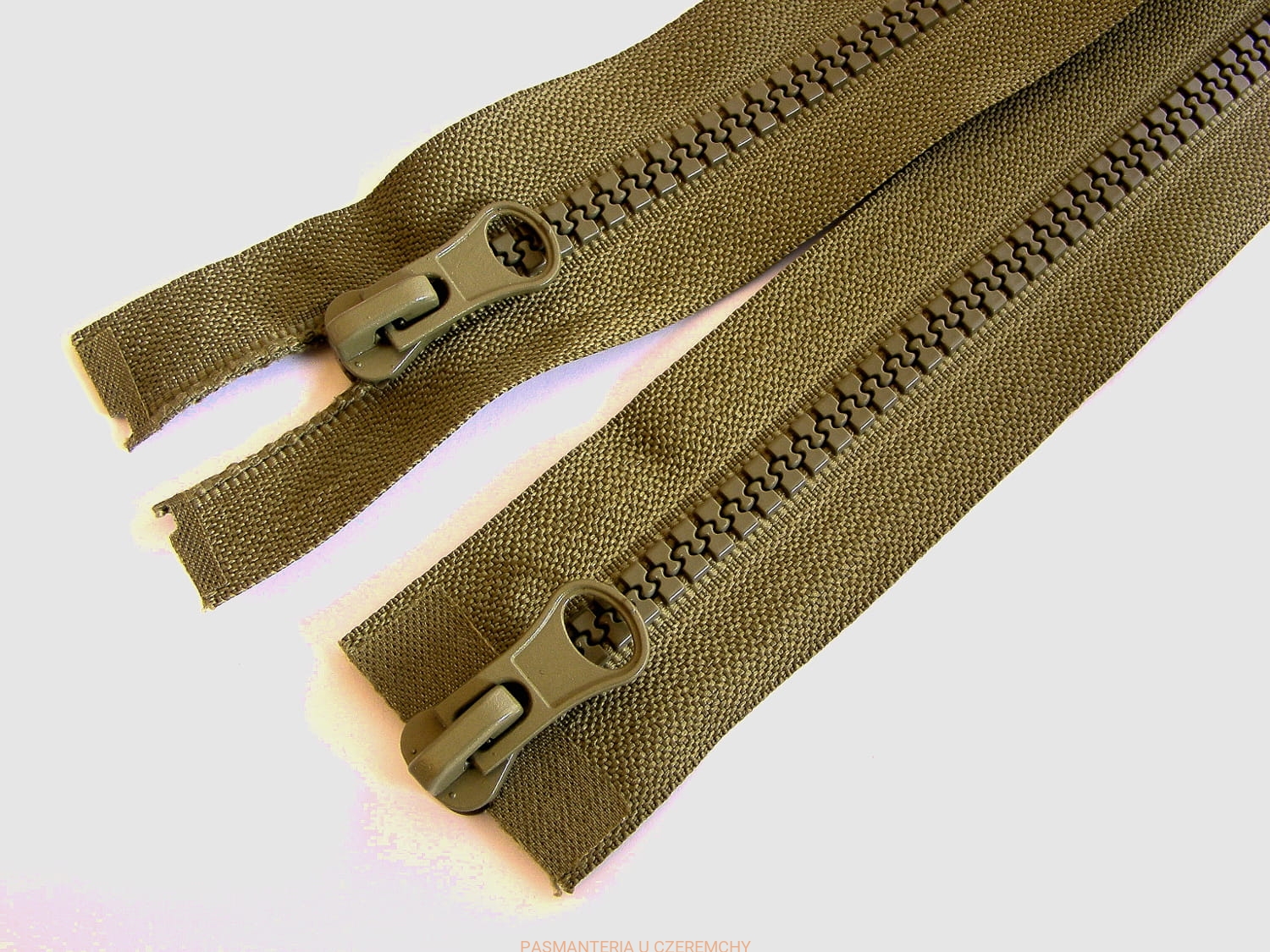 Zamek rozdzielczy dwusuwakowy typu kostka rozm. 5, dł. 85 cm, w kolorze khaki.