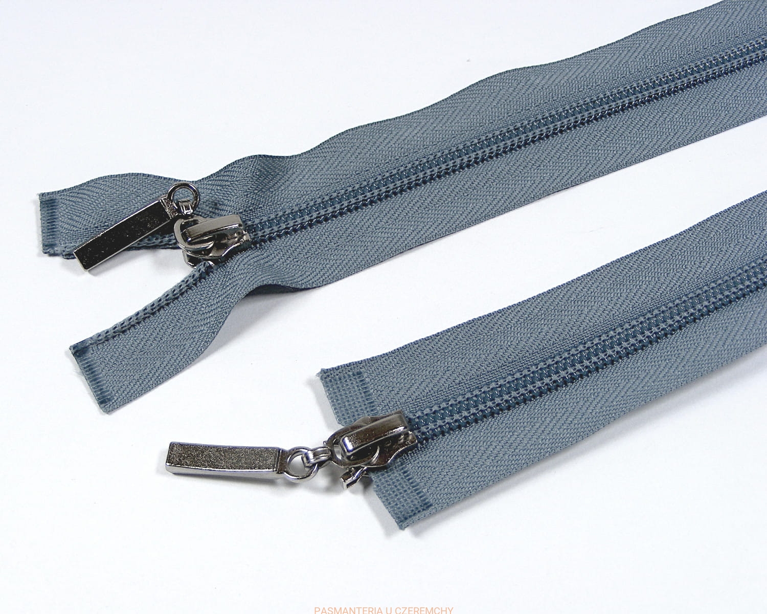 Zamek rozdzielczy dwusuwakowy plastikowy spirala rozm.5, długości 85 cm, stalowoszary. Suwaki zamka w kolorze srebrnym.