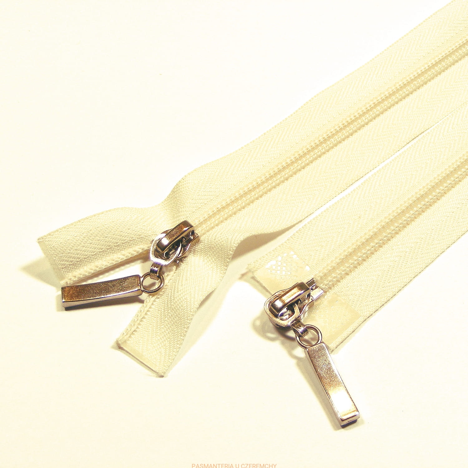 Zamek rozdzielczy dwusuwakowy plastikowy spirala 5, długości 90 cm, w kolorze ecru. Kolor suwaków - srebrny.