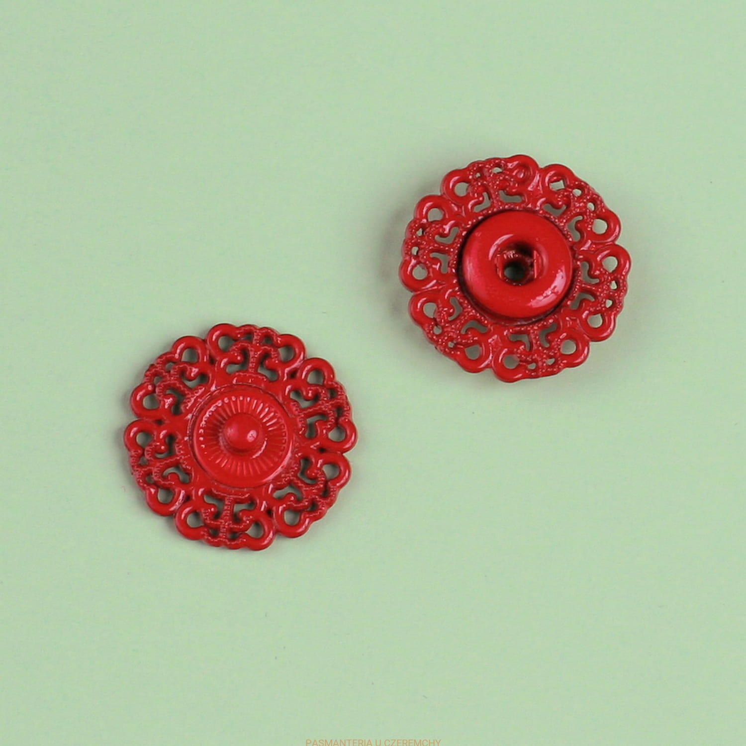 Zatrzaski metalowe do naszywania, średnicy 21 mm. Ażurowe, lakierowane, kolor czerwony.